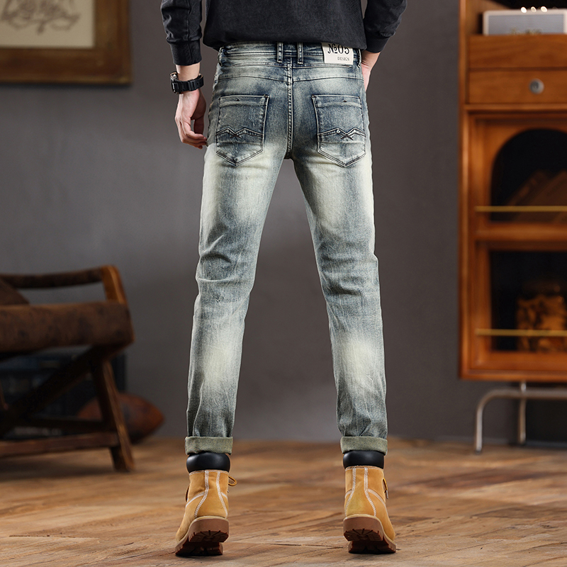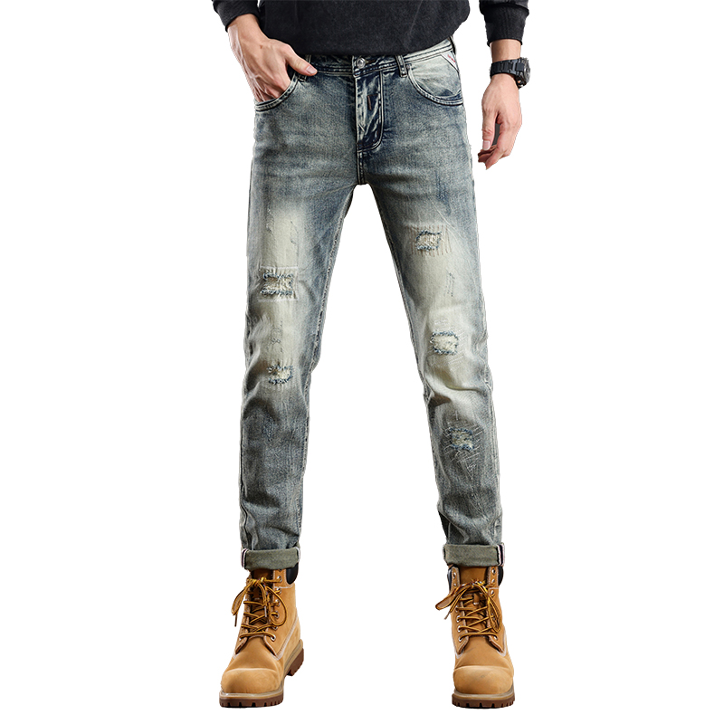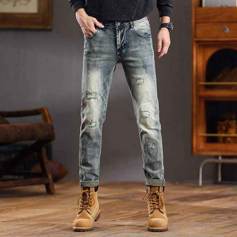 高端破洞补丁牛仔裤男款秋季2025新款小脚修身弹力男士裤子潮流