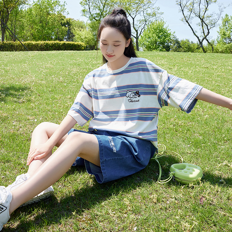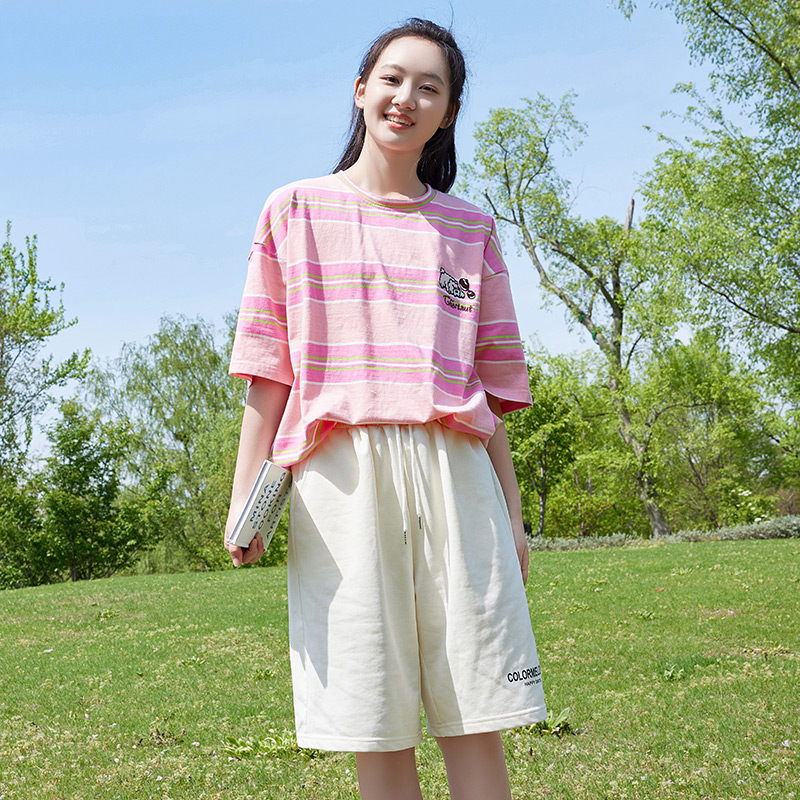 学生短袖t恤纯棉套装宽条纹少女夏装12岁13女孩16初中夏季五分裤