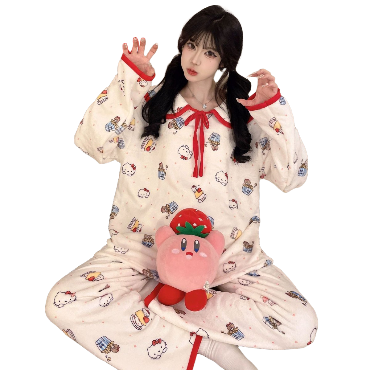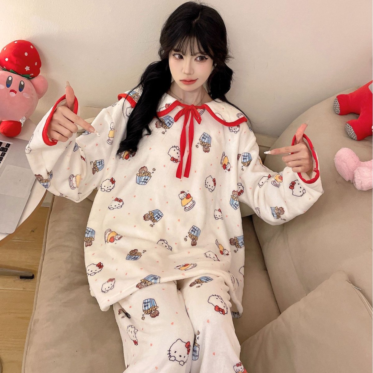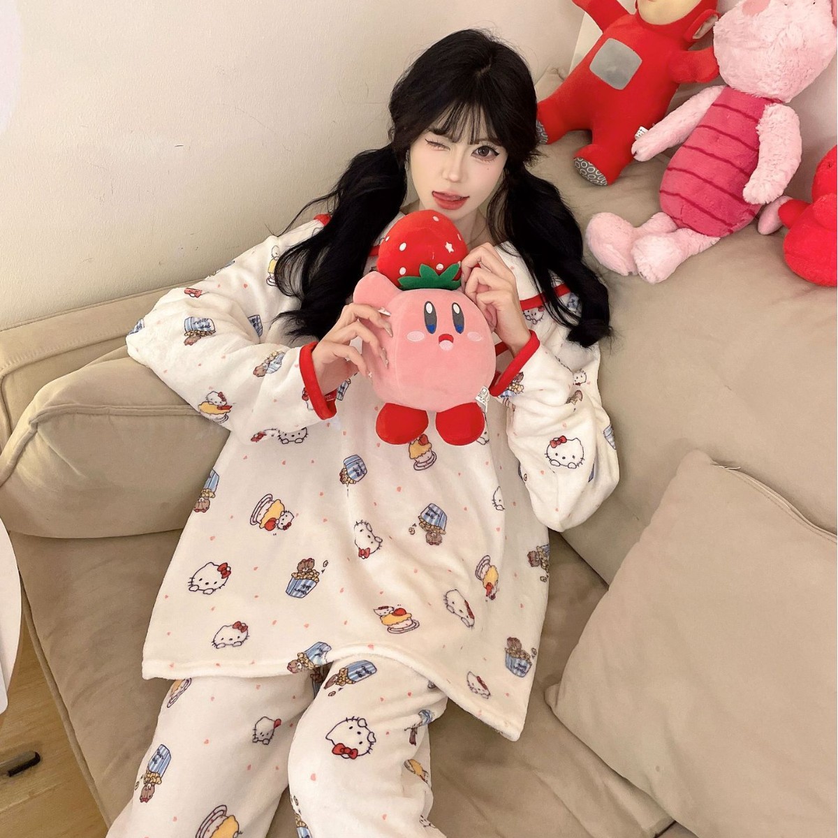 秋冬季卡通法兰绒保暖休闲睡衣亲子套头女孩法兰绒家居服套装