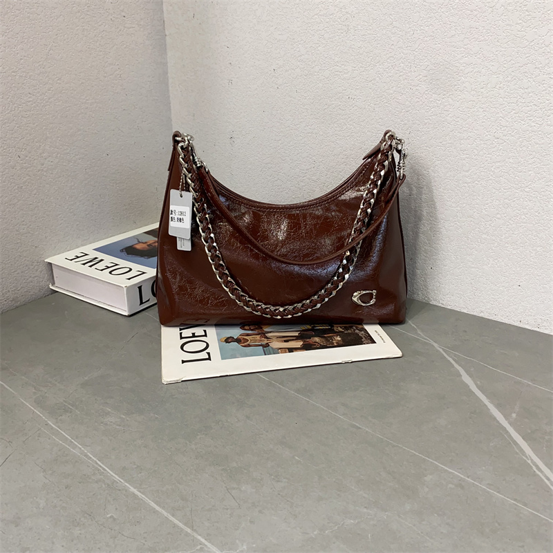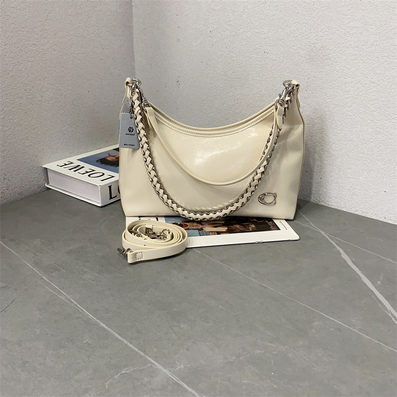 2025新款时尚油蜡皮水桶包洋气百搭链子腋下单肩包简约纯色斜跨包