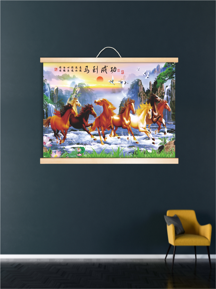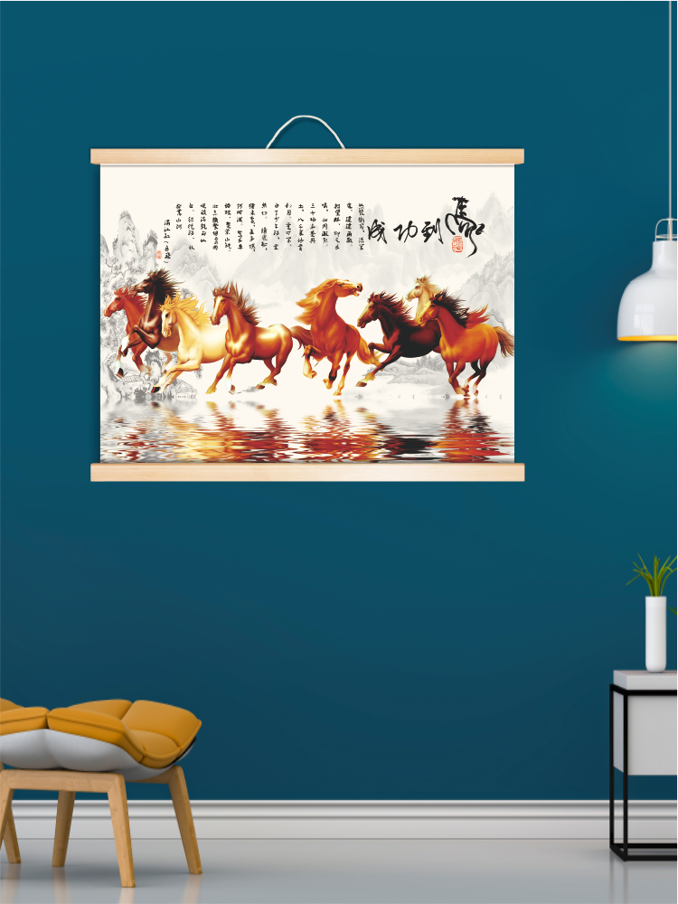 马到成功八匹马骏马图卷轴实木挂画八骏图装饰画办公室玄关风水画