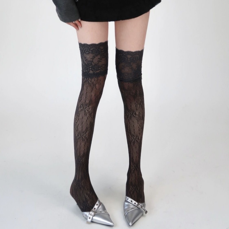 日系性感蕾丝花边长筒袜复古花卉渔网袜配靴子白色黑色过膝袜女