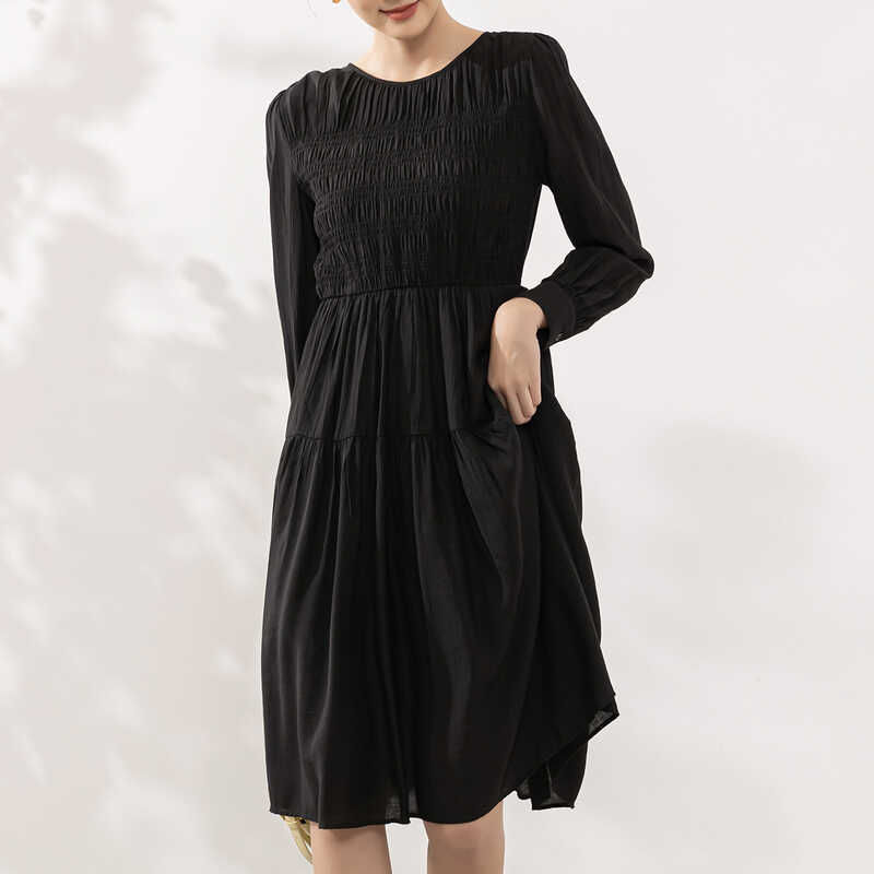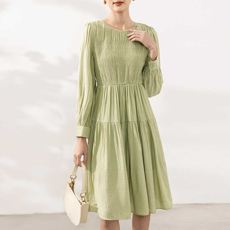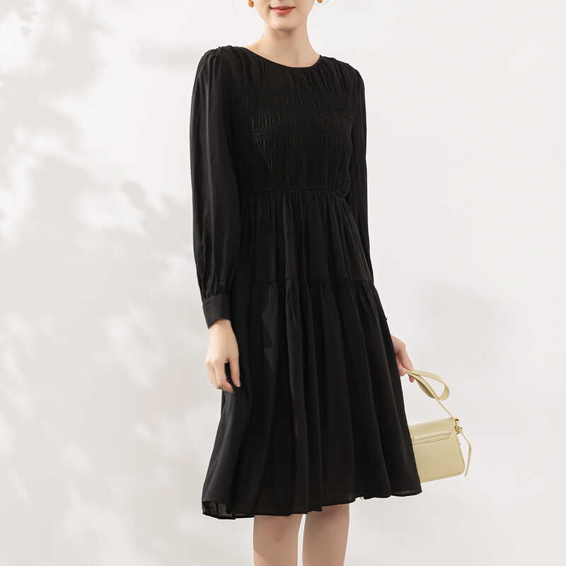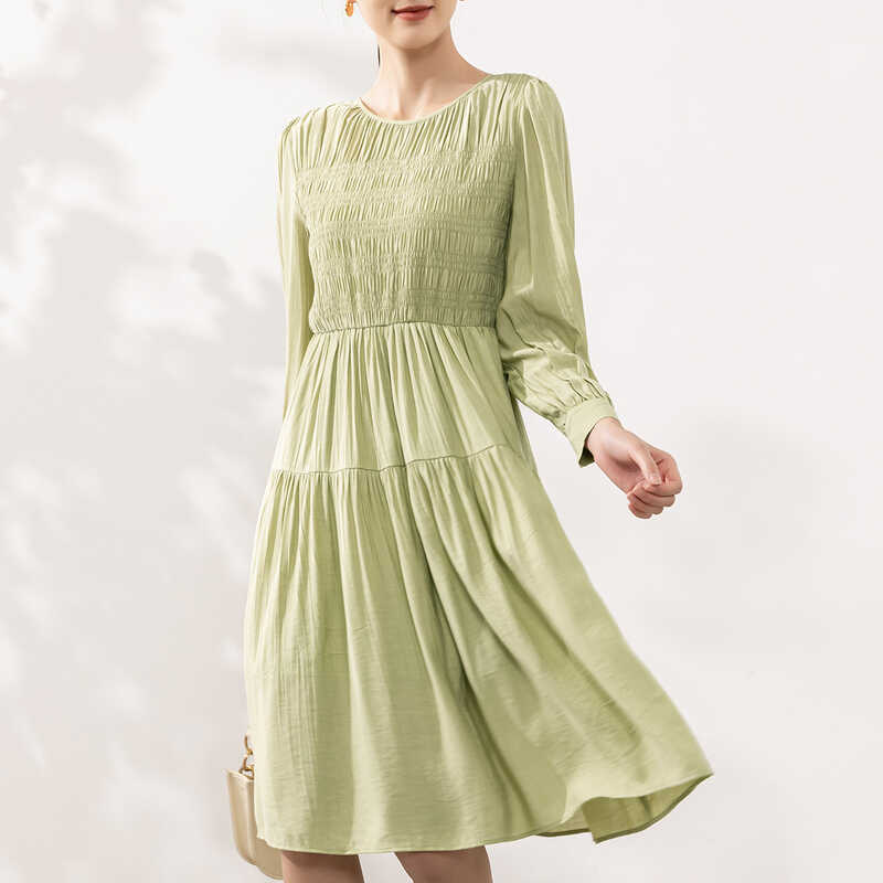 她图宽松显瘦圆领连衣裙女长袖2024春秋新款高腰显瘦中长款A字裙