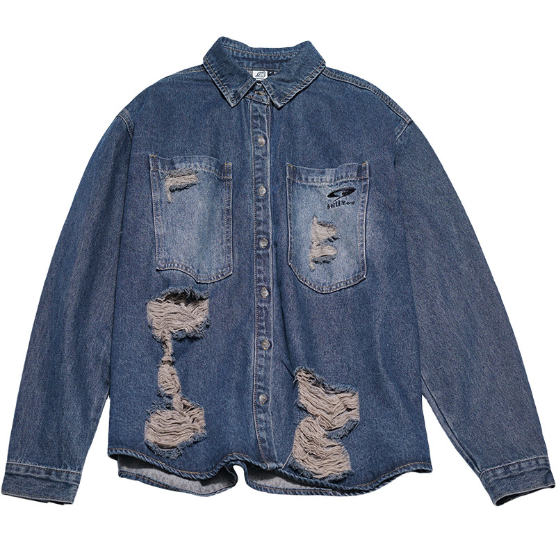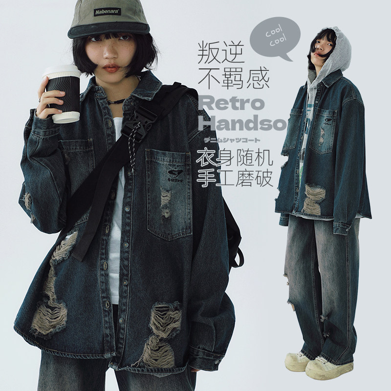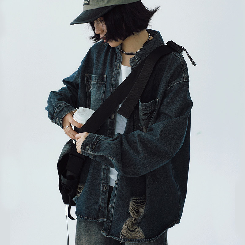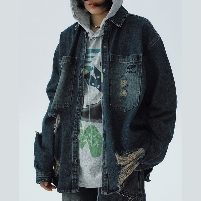 STILLYOU原创设计复古潮流单宁做旧破洞长袖牛仔衬衫式外套女宽松
