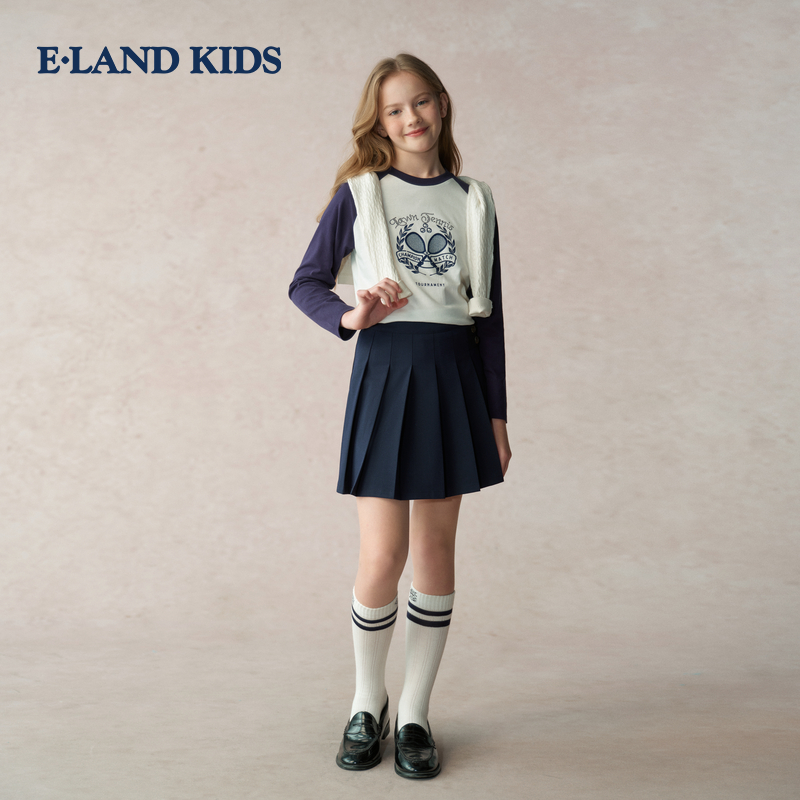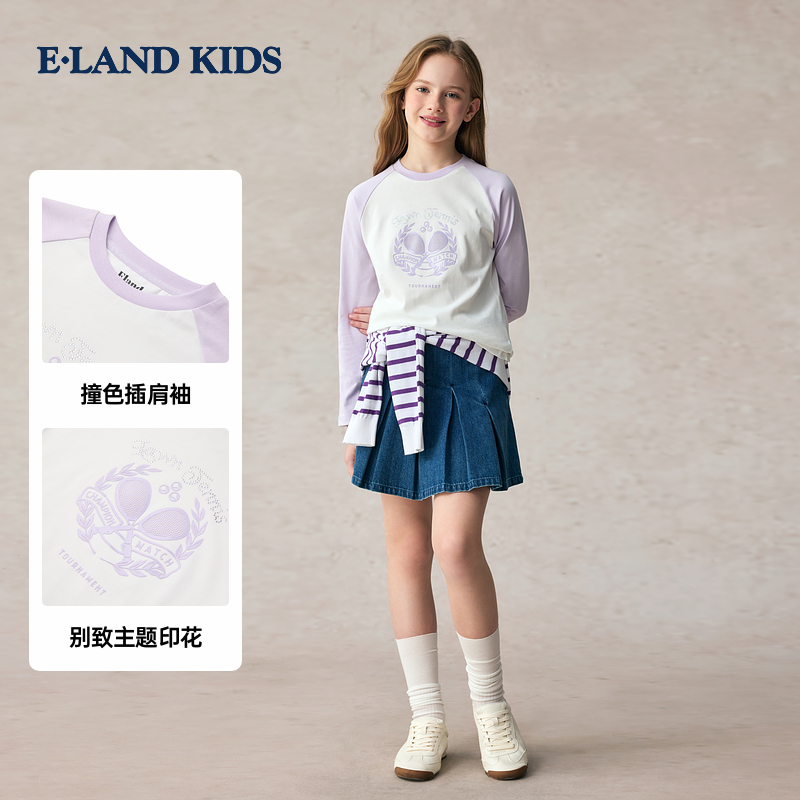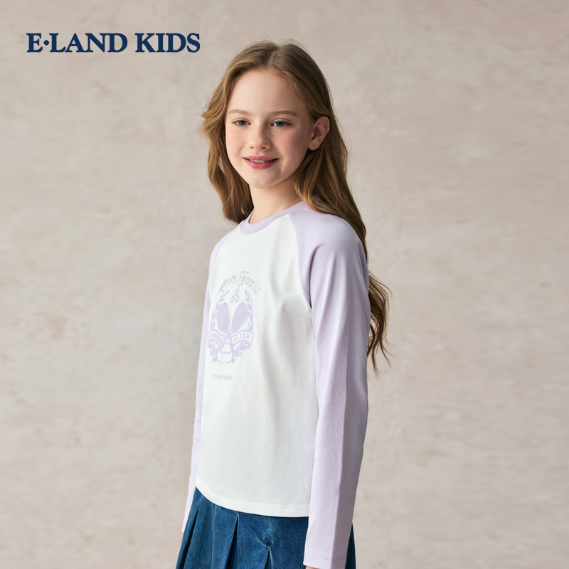 eland kids衣恋童装女童T恤2025年秋新品学院圆领插肩袖长袖上衣