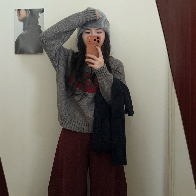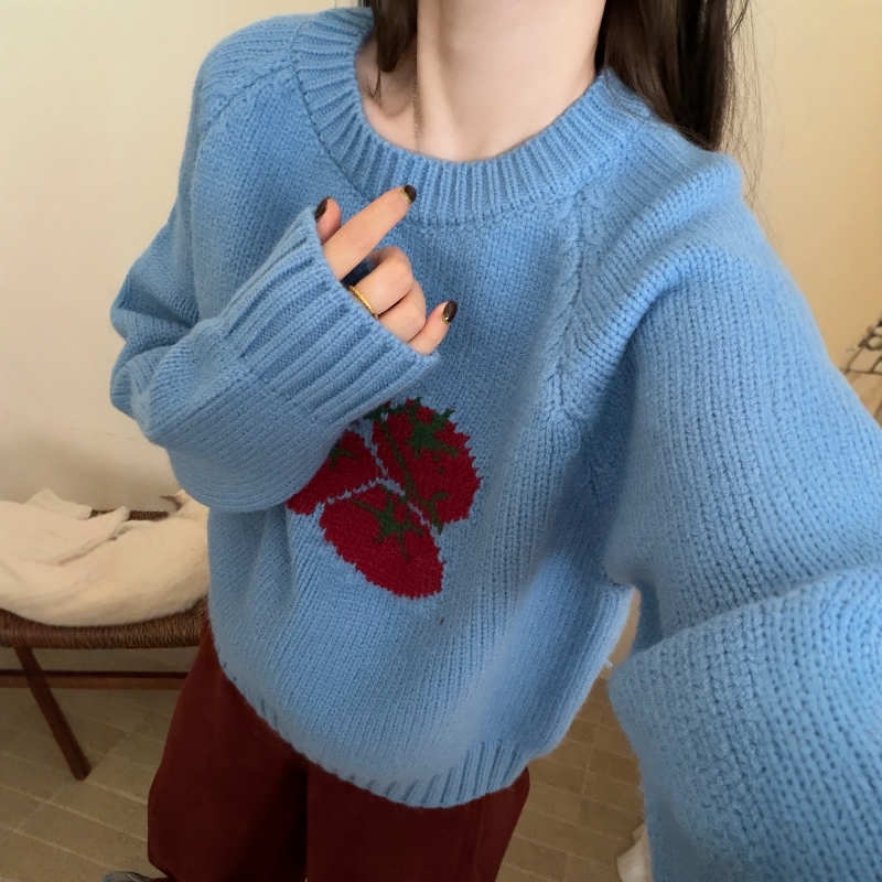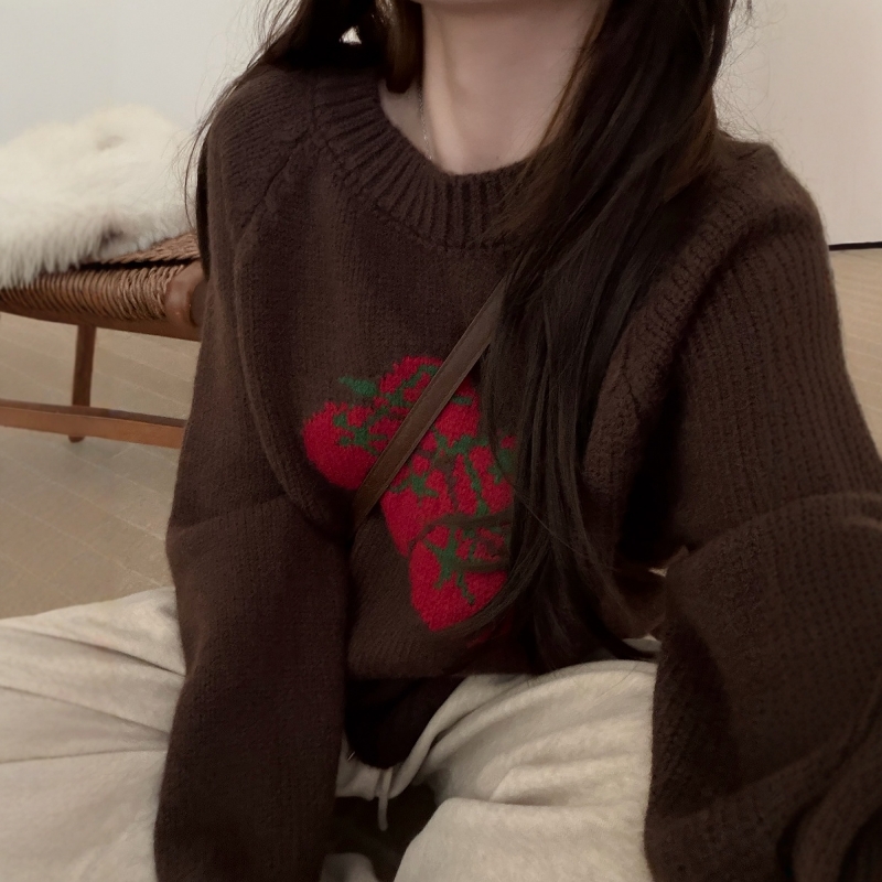 此外 圆领卡通可爱针织衫女2025秋冬新款加厚番茄提花套头毛衣潮