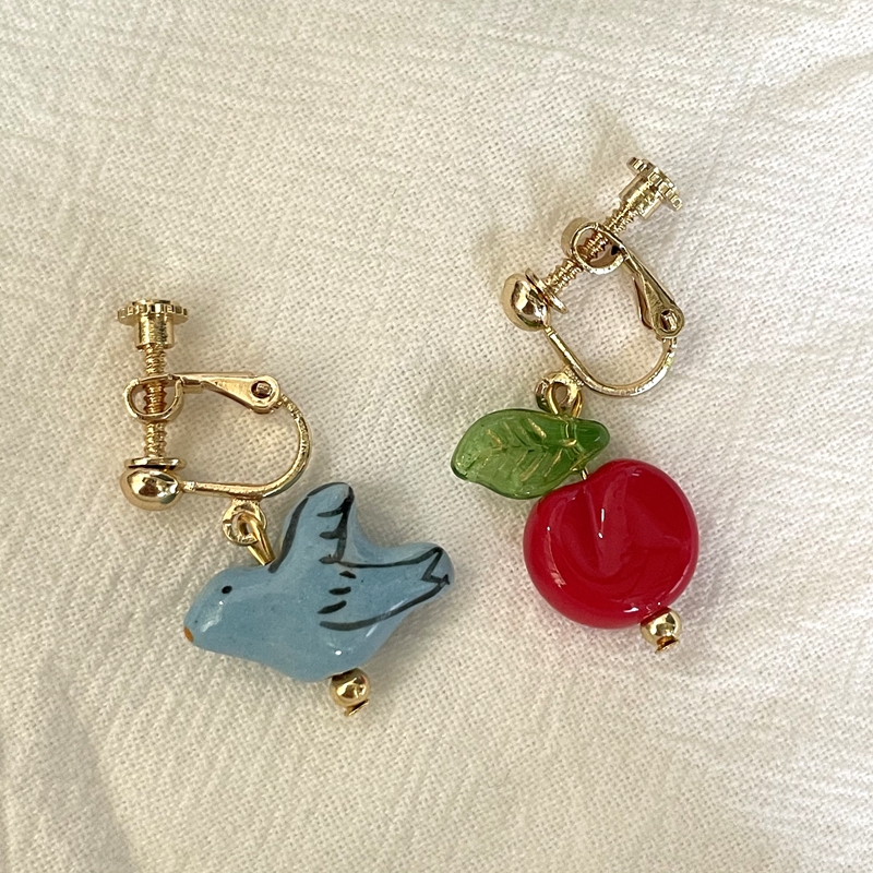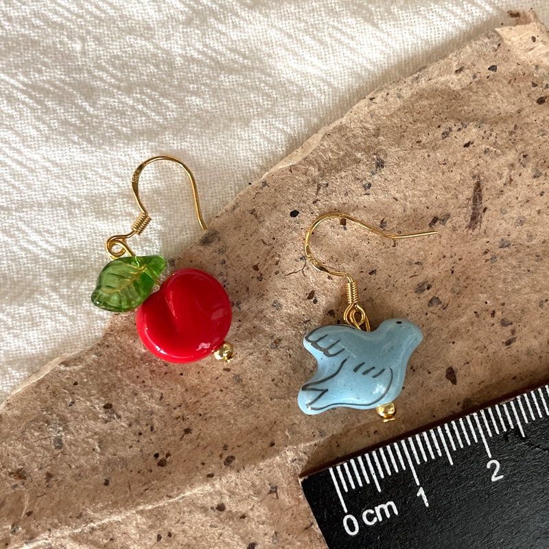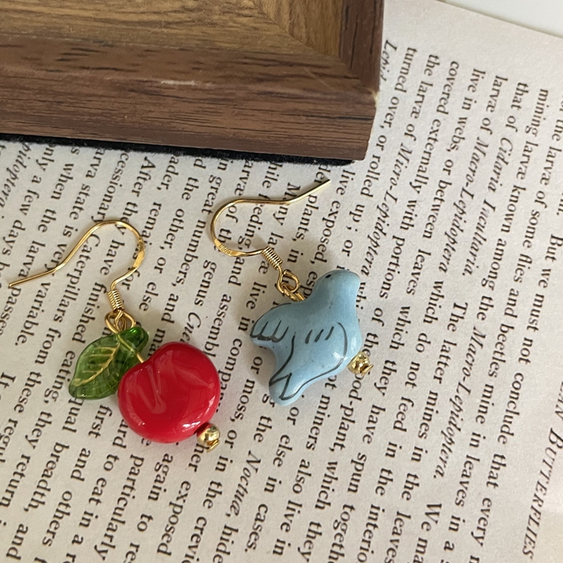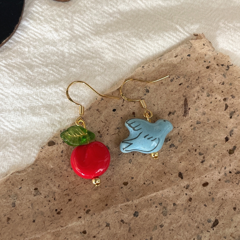 原创手作手绘风陶瓷小鸟不对称耳环小鸟与苹果耳环无耳洞耳夹