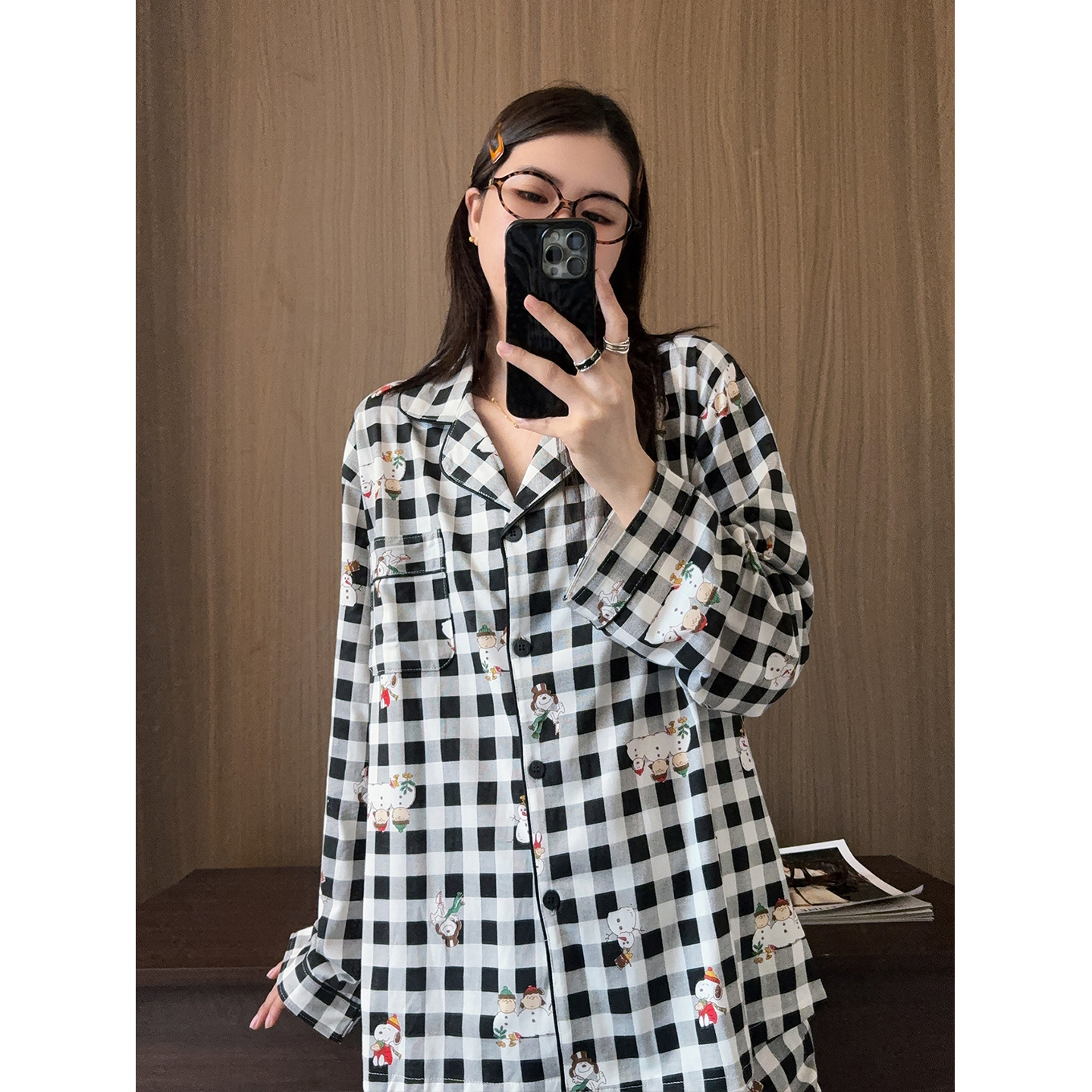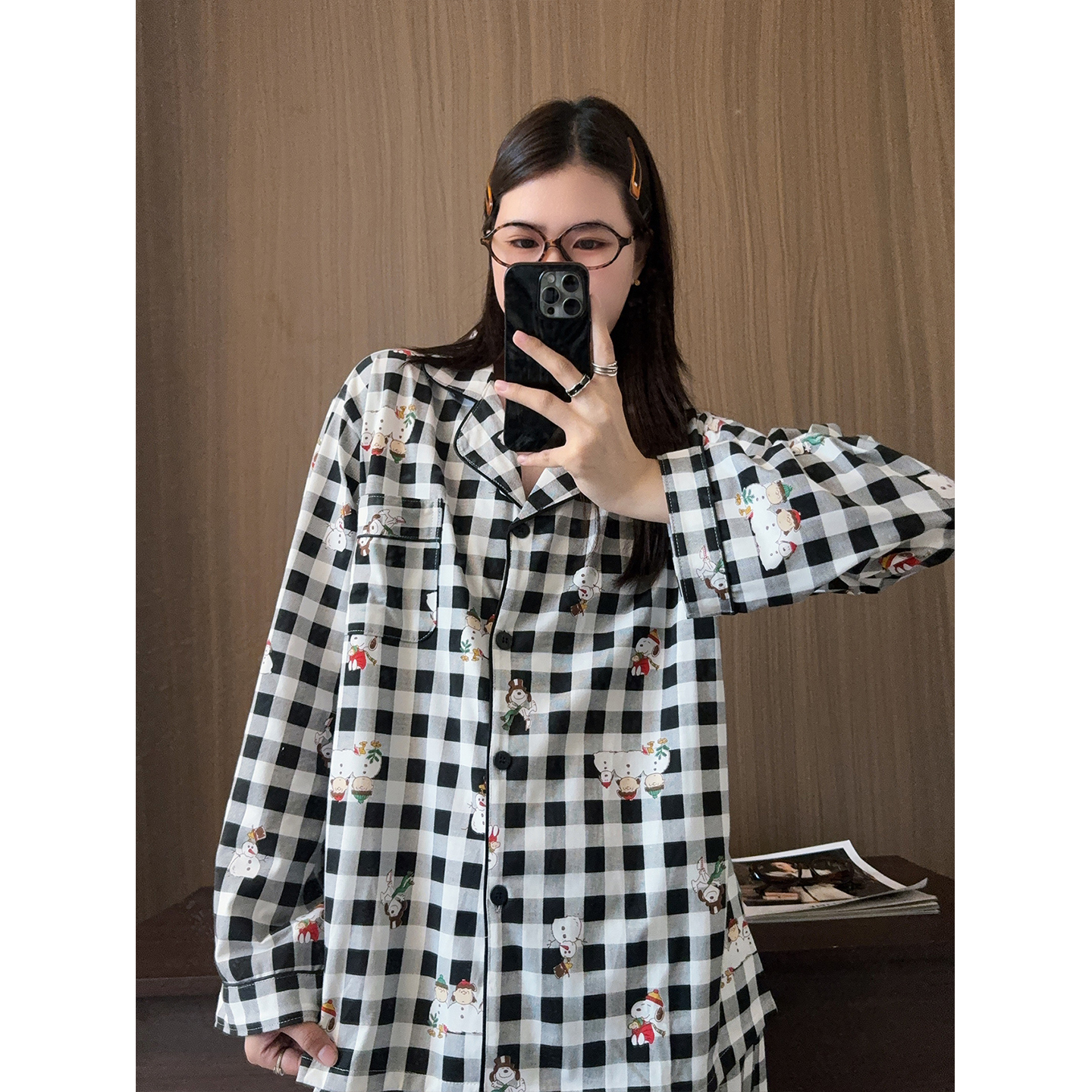 日系卡通史努比纯棉睡衣女士开衫格纹长袖长裤春秋家居服情侣套装