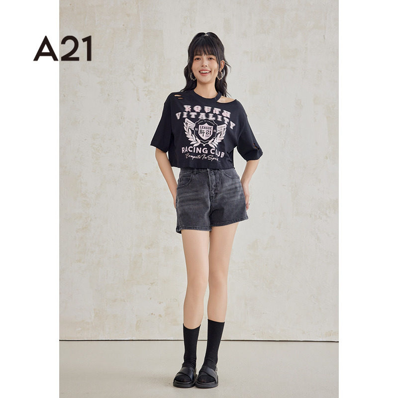 A21女装设计感印花针织宽松圆领落肩短袖t恤夏季后背破洞上衣女