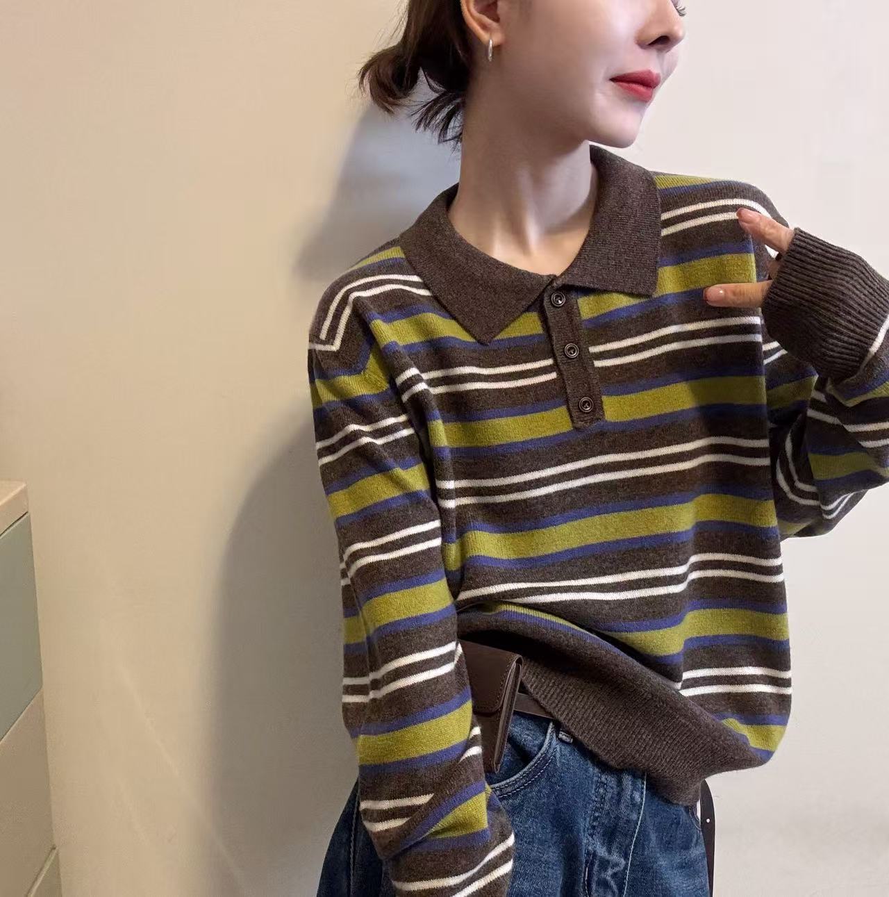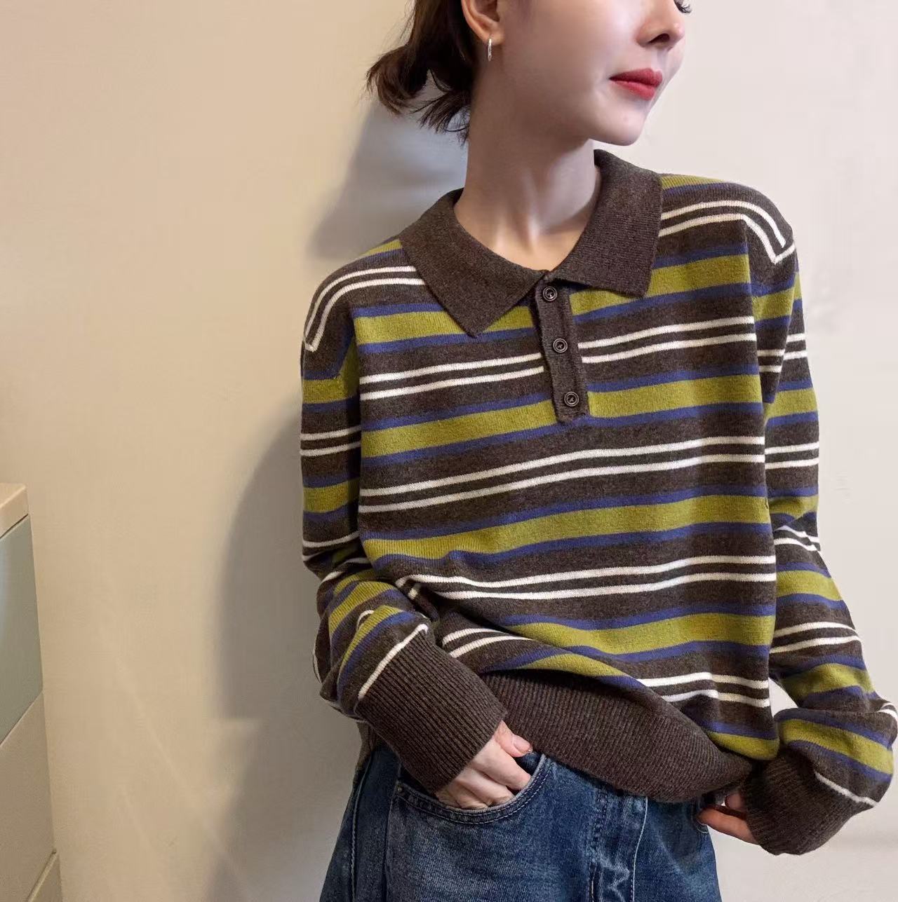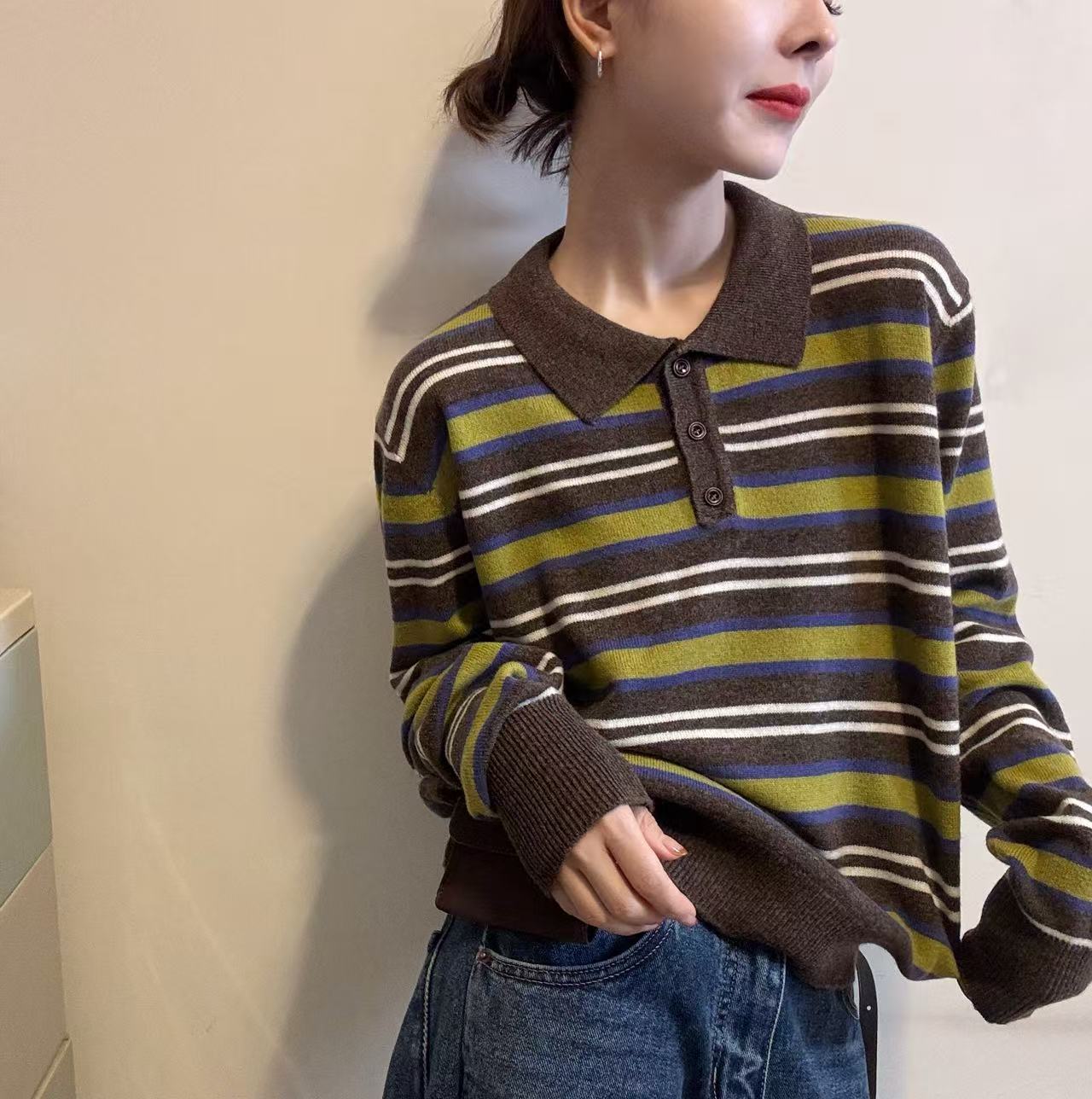 BADX正品韩系高级感条纹针织polo衫女25秋季套头毛衣洋气减龄上衣