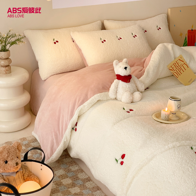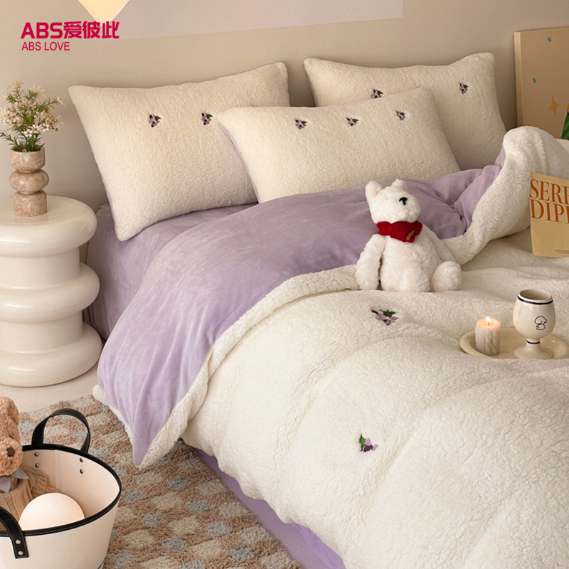 ABS新款刺绣床单四件套牛奶绒冬季被罩羊羔绒被套宿舍床单三件套