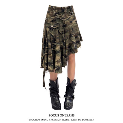 美式复古迷彩工装牛仔半身裙女夏季辣妹高街设计感宽松显瘦a字裙
