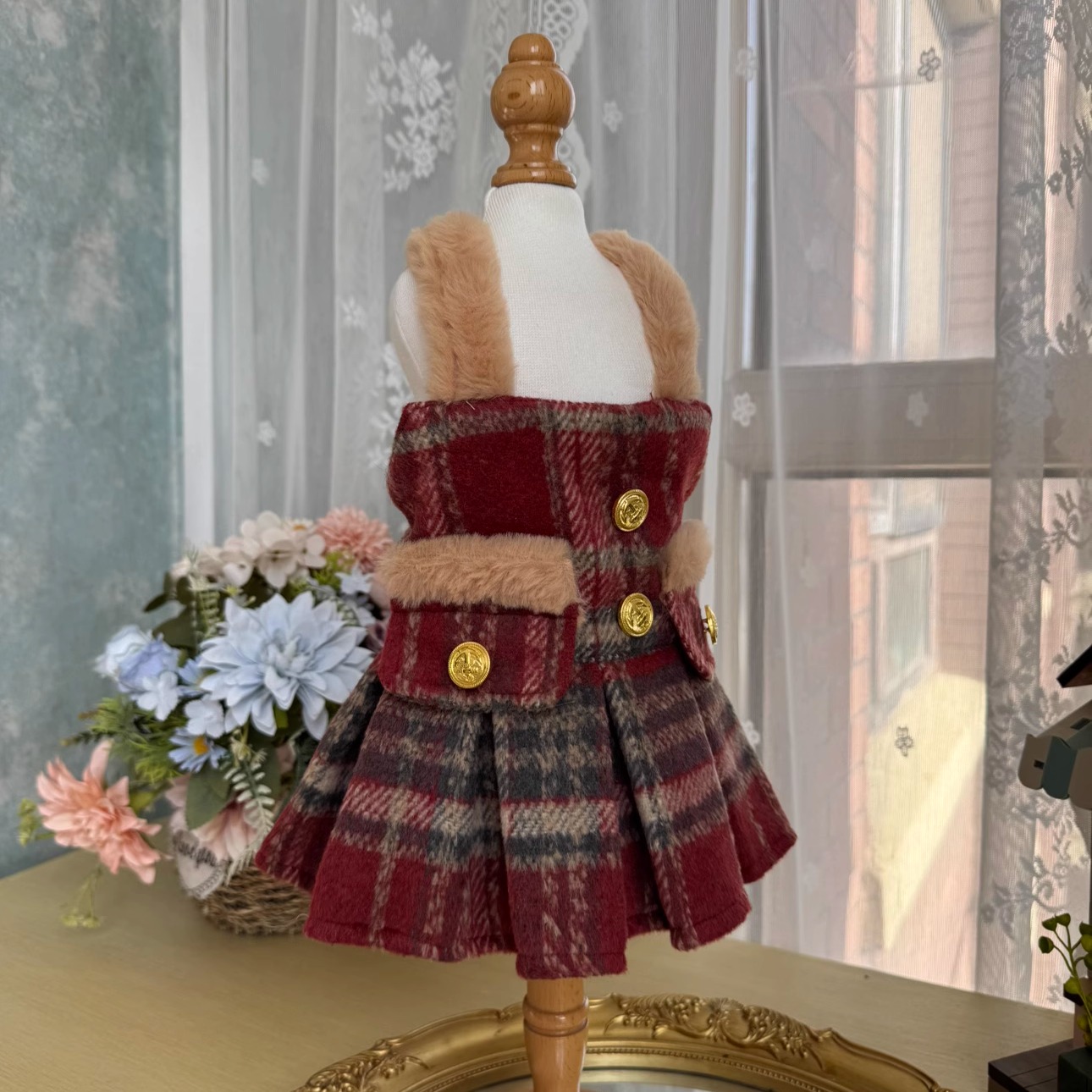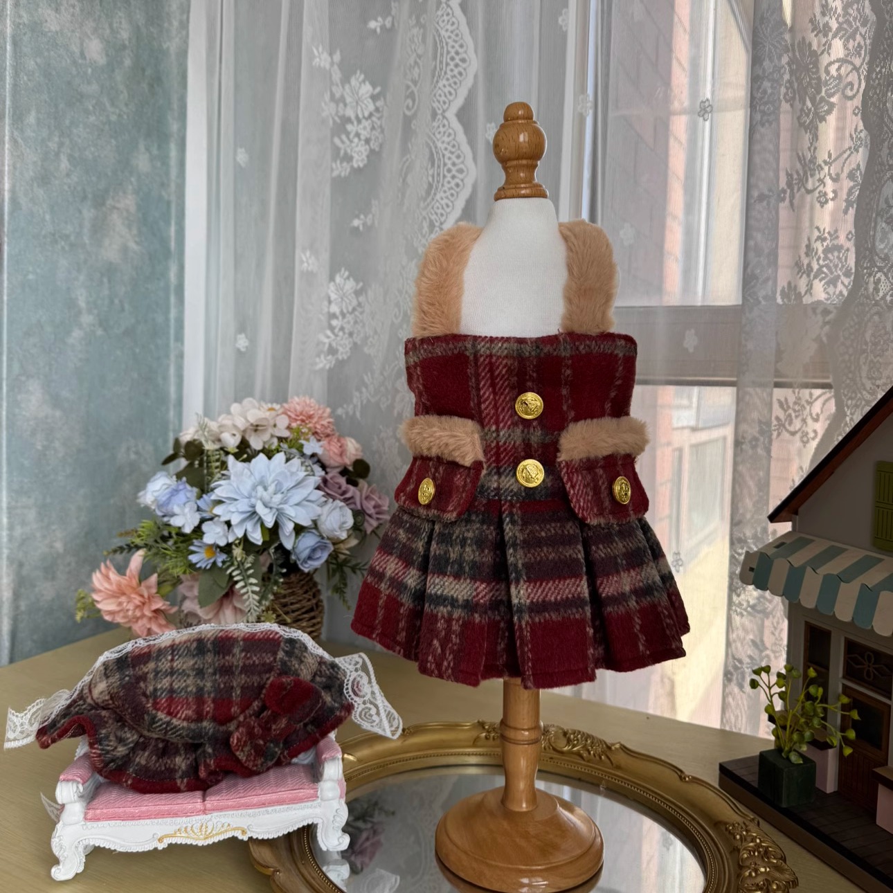 原创手工定制宠物衣服狗狗小型犬宠物服饰猫咪毛呢格子背带裙酒红