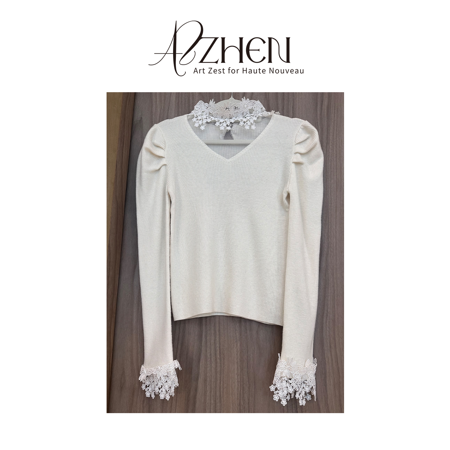 AZZHEN【蕾丝热恋】V领假两件蕾丝打底针织衫女秋季新款内搭上衣