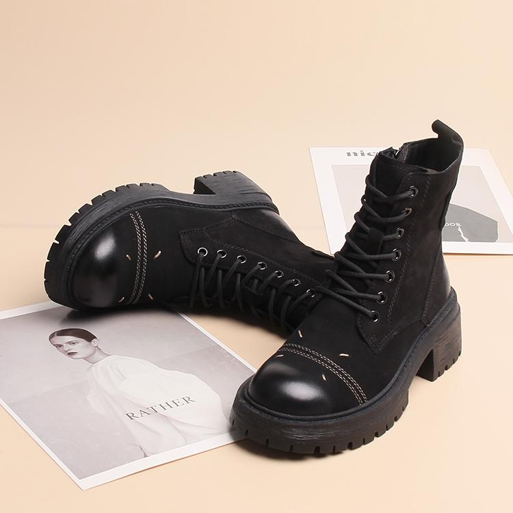 嘉俪多女鞋欧美短靴马丁靴羊磨砂冬季薄绒粗跟系带拉链2025新款