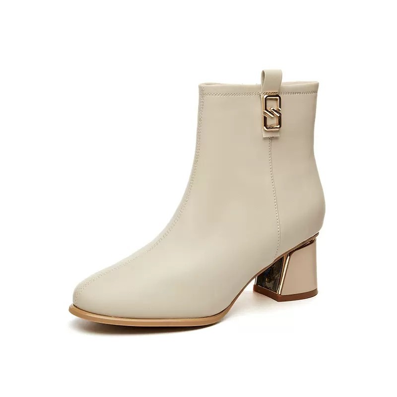 马丁靴子女靴2023年新款春秋短靴百搭粗跟中跟高跟鞋米白色时装靴