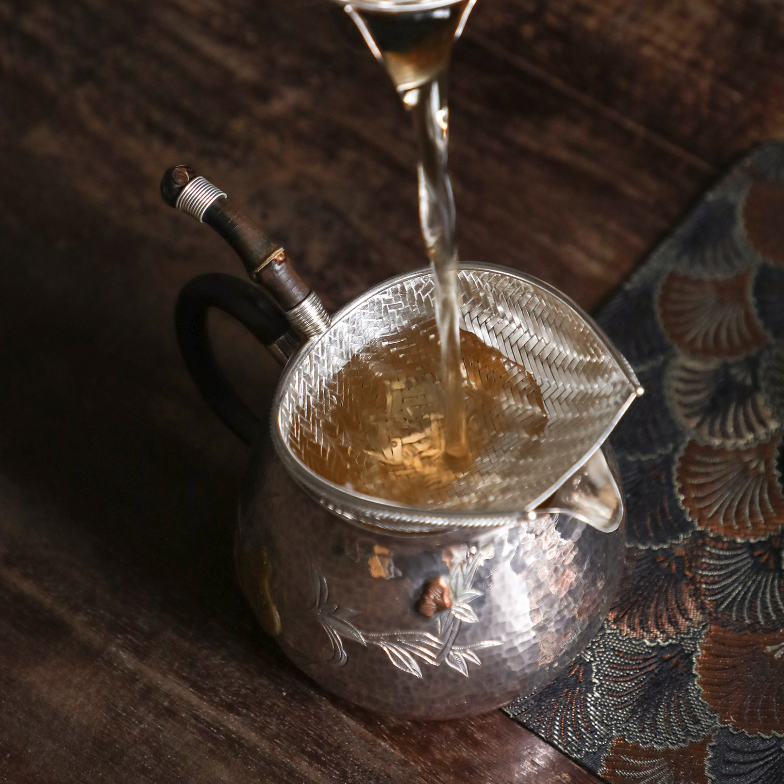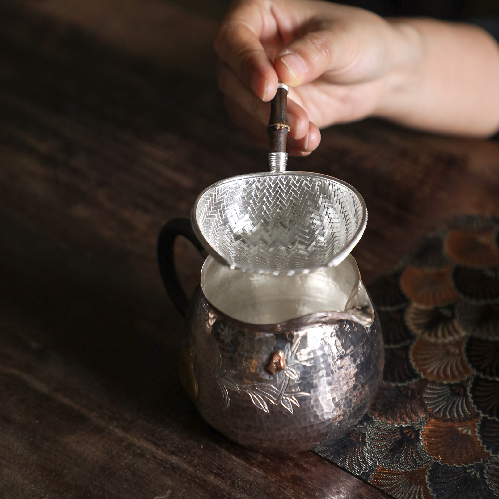 纯银时代 银编簸箕茶漏茶滤足银999紫竹把纯手工编制创意精致送礼