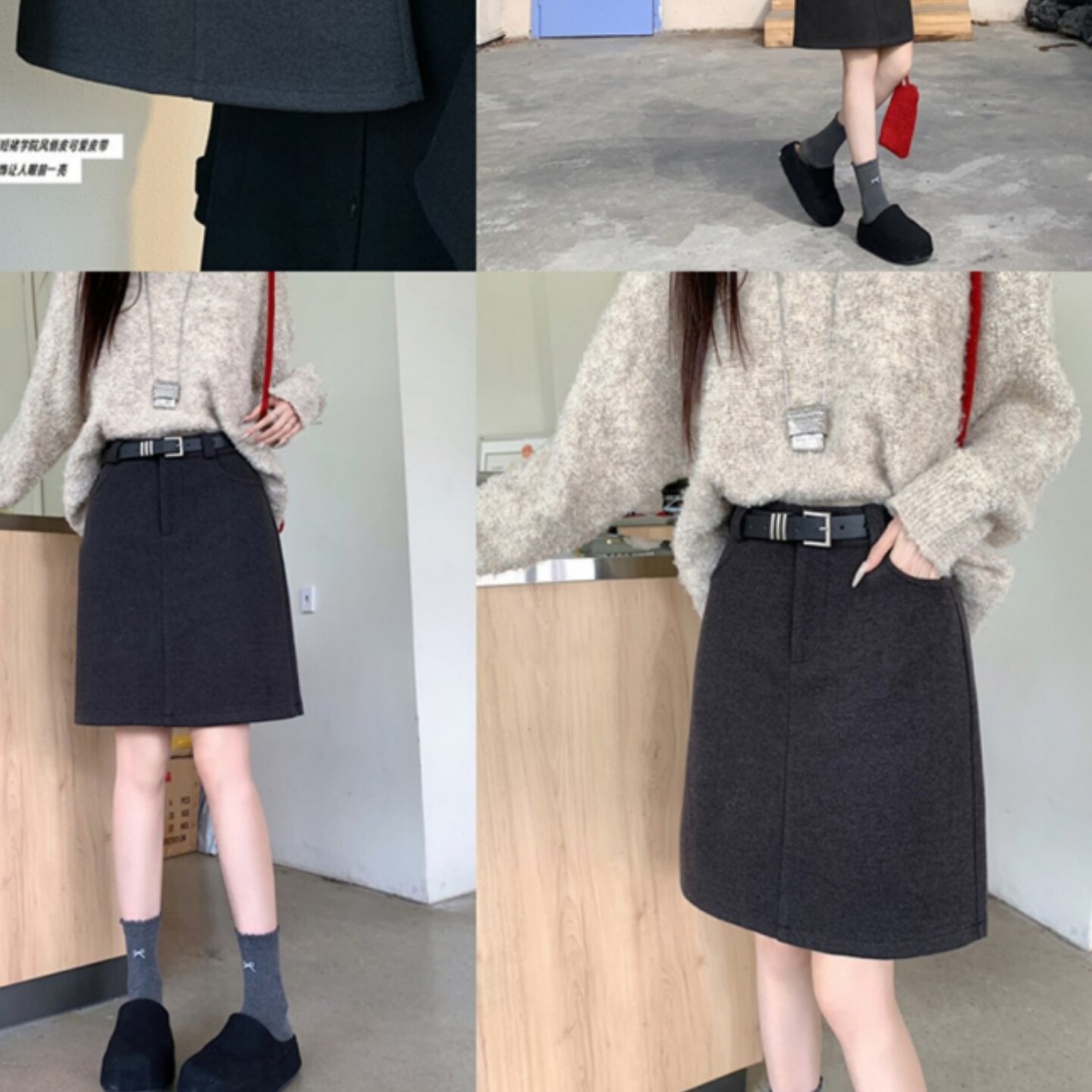 大码灰色加长款毛呢半身裙遮肚裙