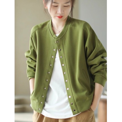 时尚针织棉长袖外套女春秋新款棒球服休闲宽松百搭开衫圆领上衣潮