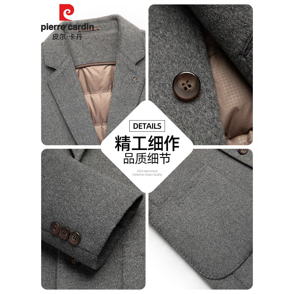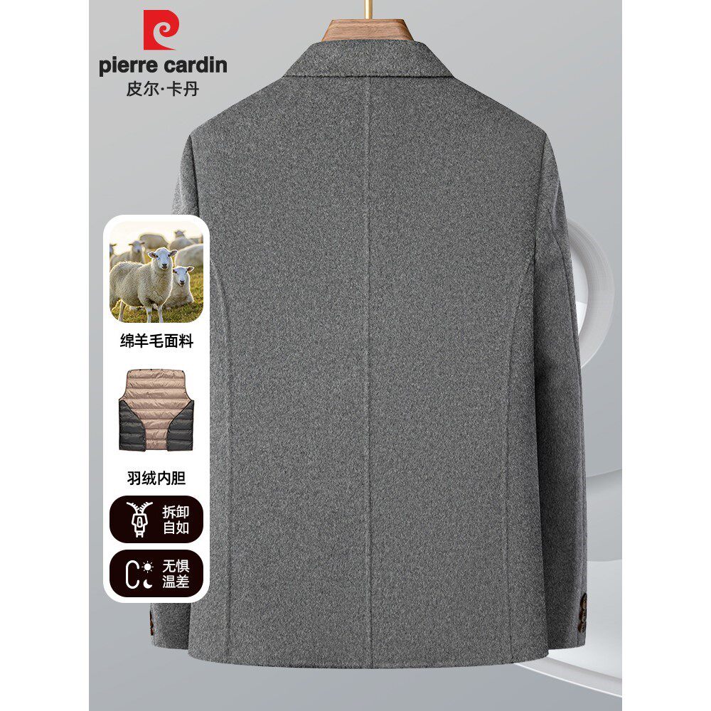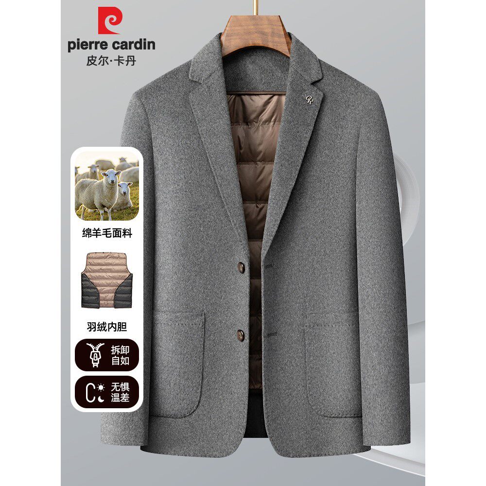 皮尔卡丹西服男冬季羽绒内胆时尚保暖小西装双面羊毛呢子外套上衣