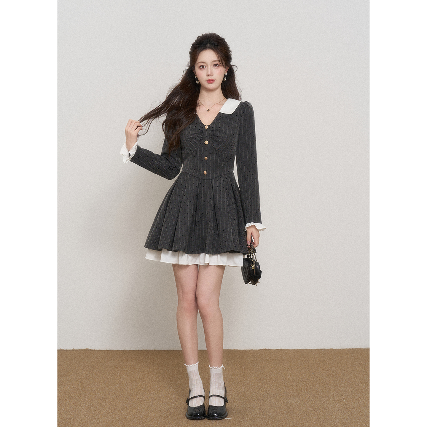 法式灰色v领波点连衣裙女2025年秋季新款小香风收腰学院风a字短裙