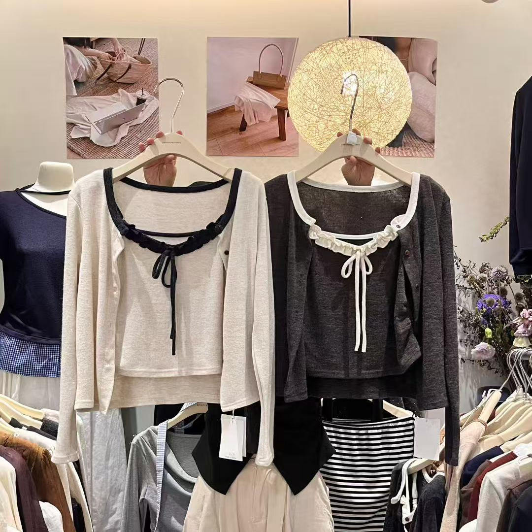 十三行时尚圆领针织开衫女秋季新款宽松百搭毛衣外套吊带两件套