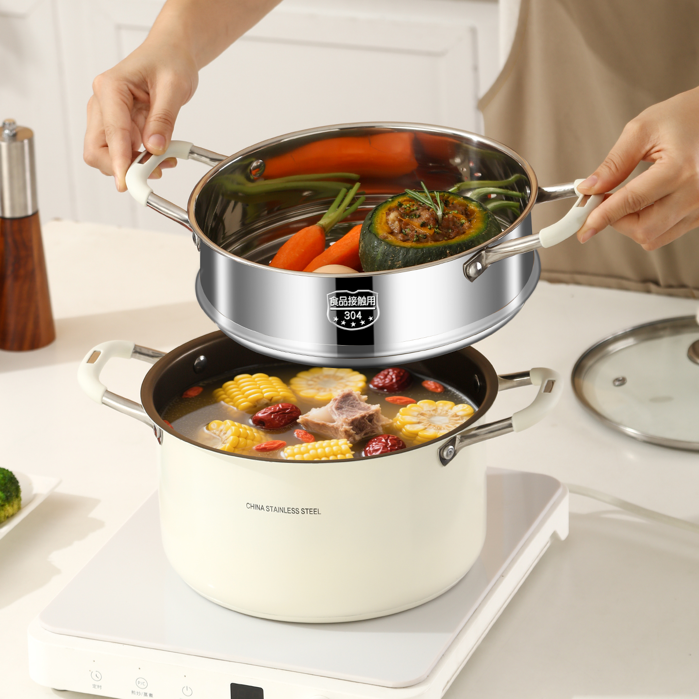 304不锈钢蒸锅家用陶瓷煮粥汤锅