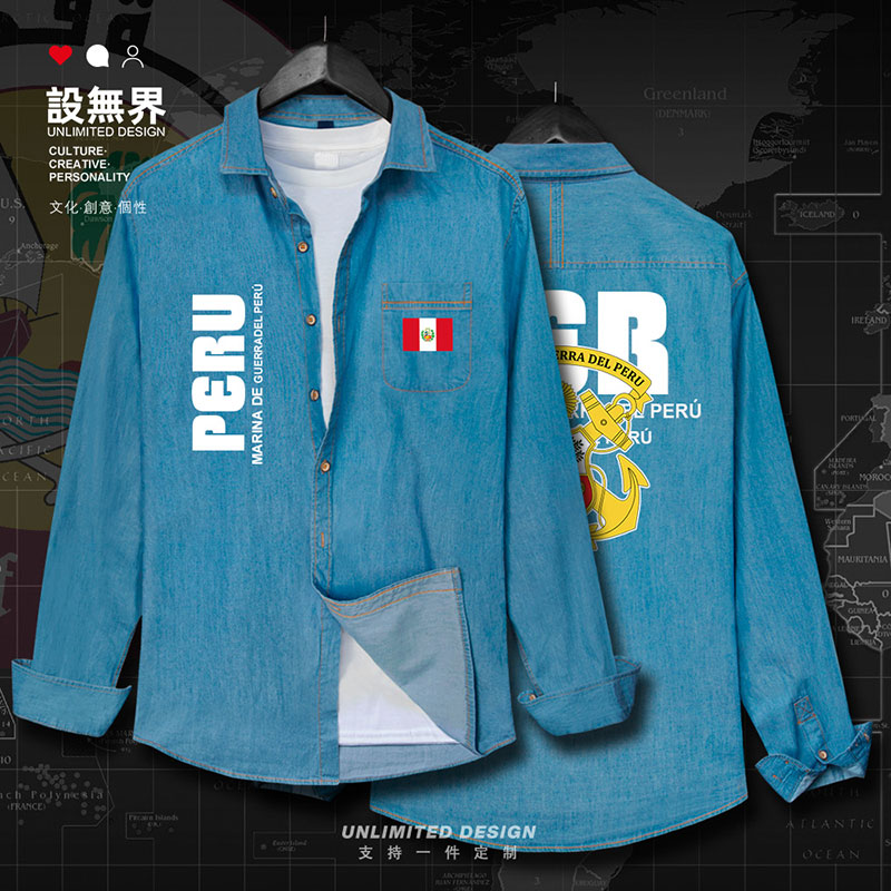 秘鲁Peru海军薄款印花军迷国家部队牛仔衬衫男女长袖衣服设 无界