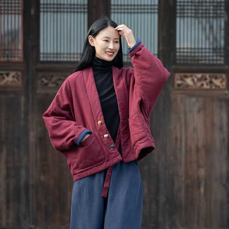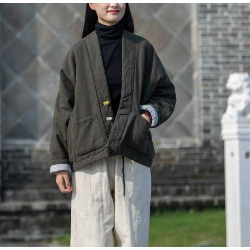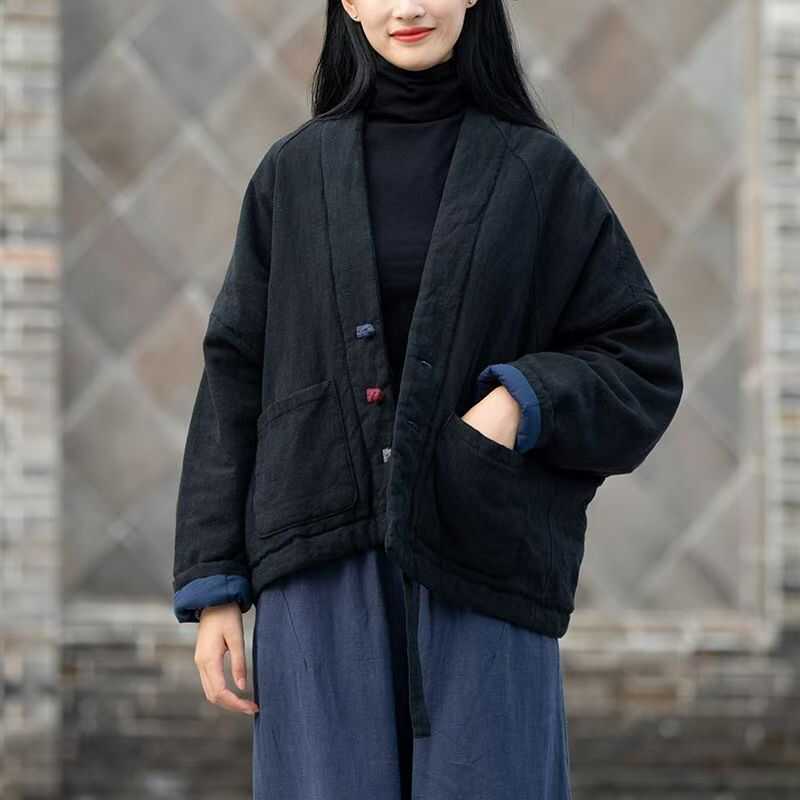 冬棉麻女文艺复古盘扣夹棉上衣女式保暖短款棉衣加厚棉袄棉服宽松