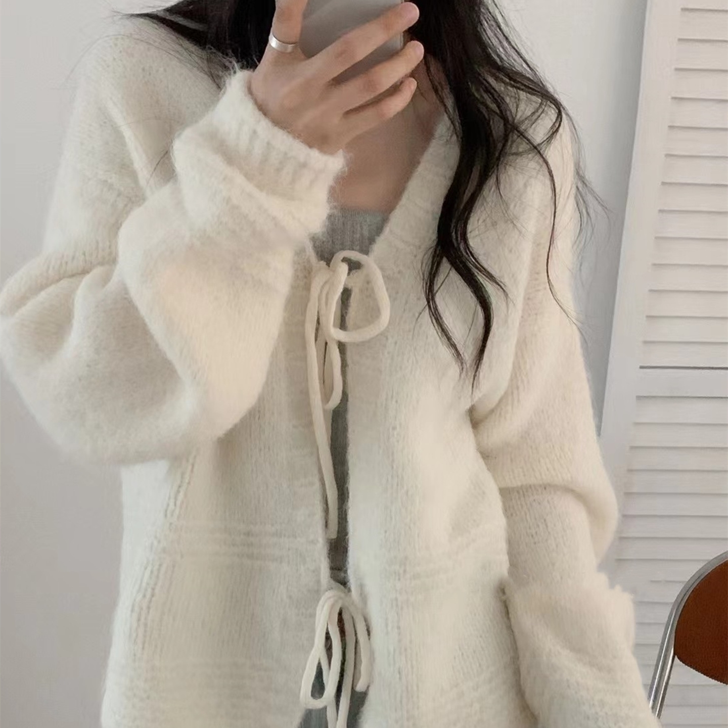 树莓色秋冬新款绑带针织开衫韩系外搭设计感上衣女士宽松毛衣外套