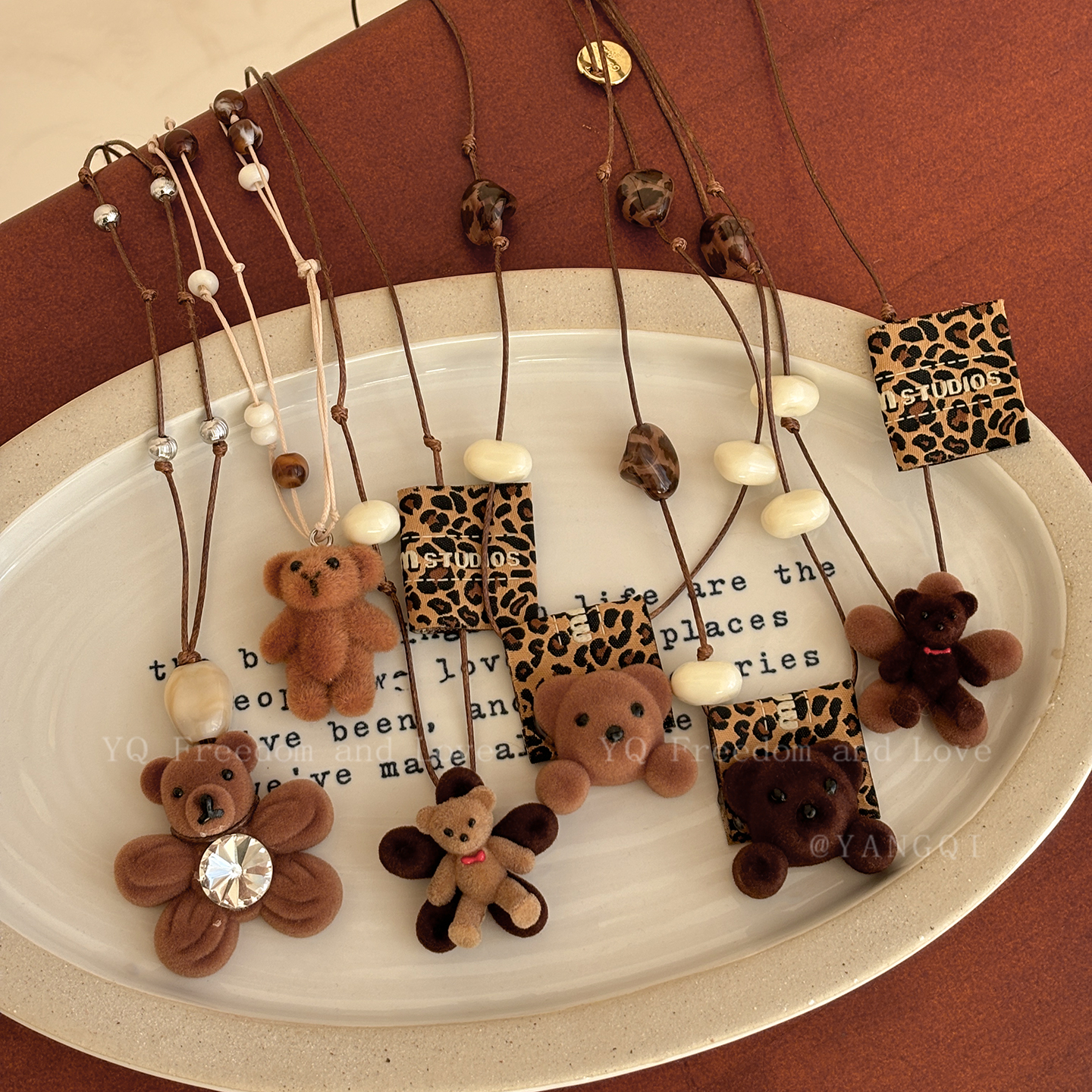 可爱爆棚!毛绒豹纹小熊串珠项链女秋冬美拉德复古毛衣链长款配饰