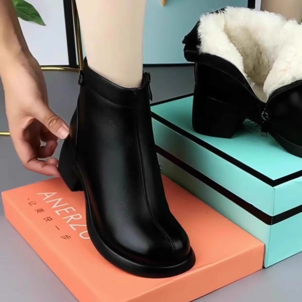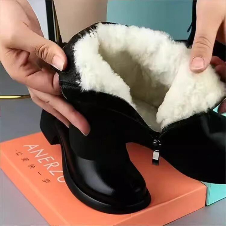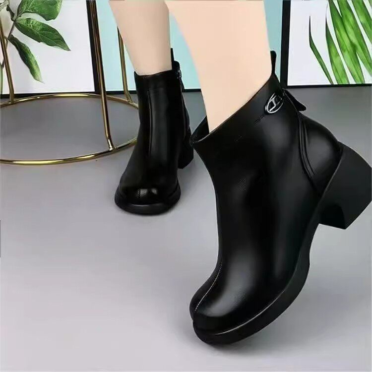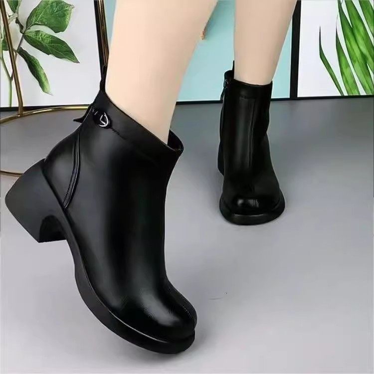 品牌真皮粗跟中跟短靴女冬季新款加绒保暖妈妈鞋棉鞋圆头马丁靴女