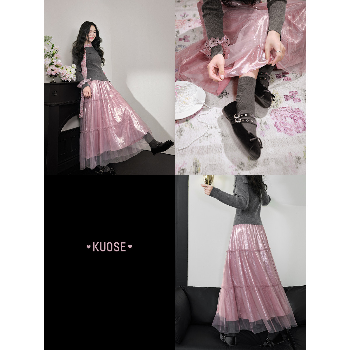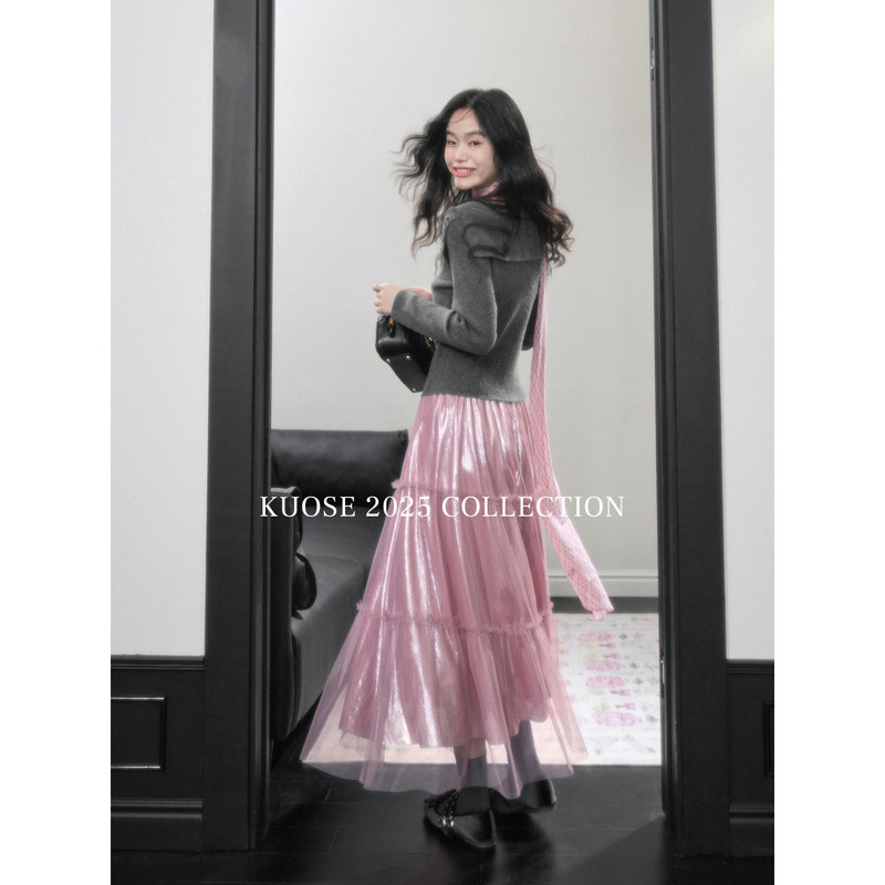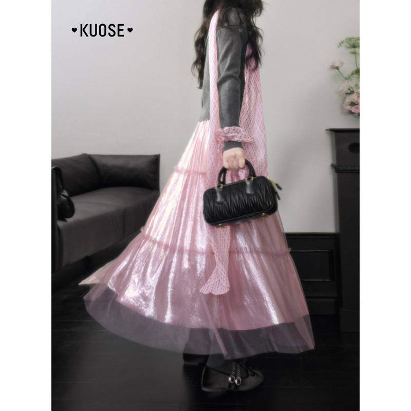 阔色粉色亮闪纱裙气质半身裙a字长裙子2025秋冬季新款女伞裙半裙