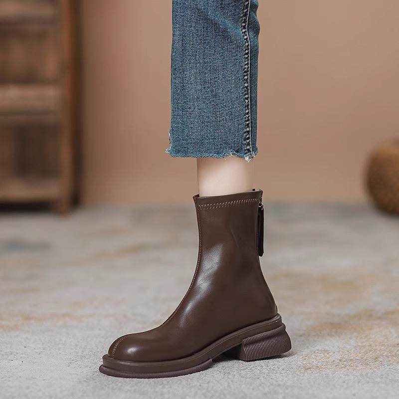 加绒马丁靴女2025秋季新款单靴平底弹力瘦瘦靴英伦风复古真皮短靴