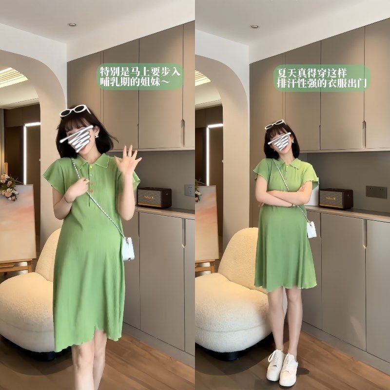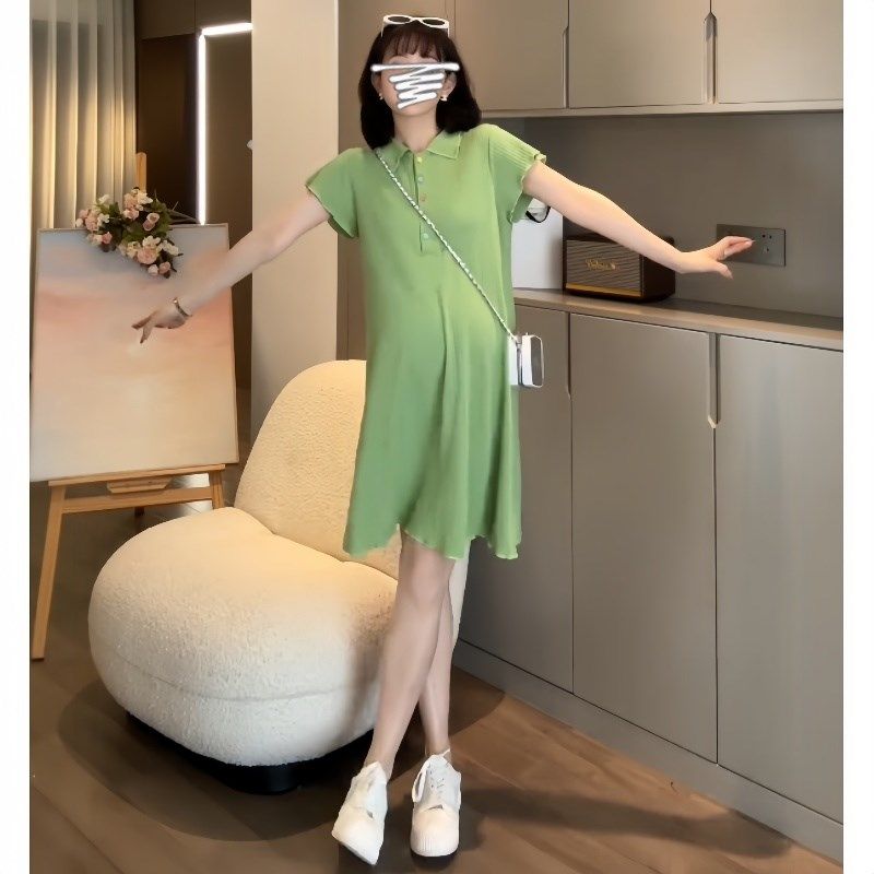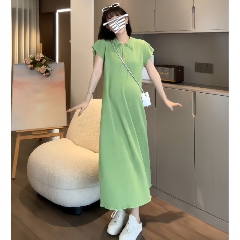 时尚孕妇装2024夏装新款翻领短袖中长款休闲外穿显瘦减龄女连衣裙