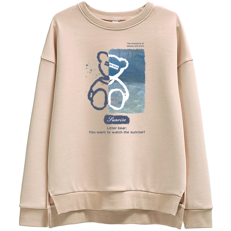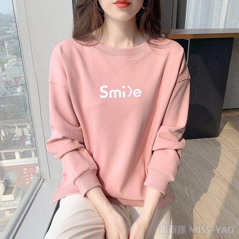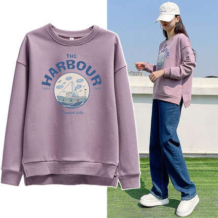 秋冬新款圆领开叉卫衣女加绒韩版宽松大码套头长袖小个子薄款上衣