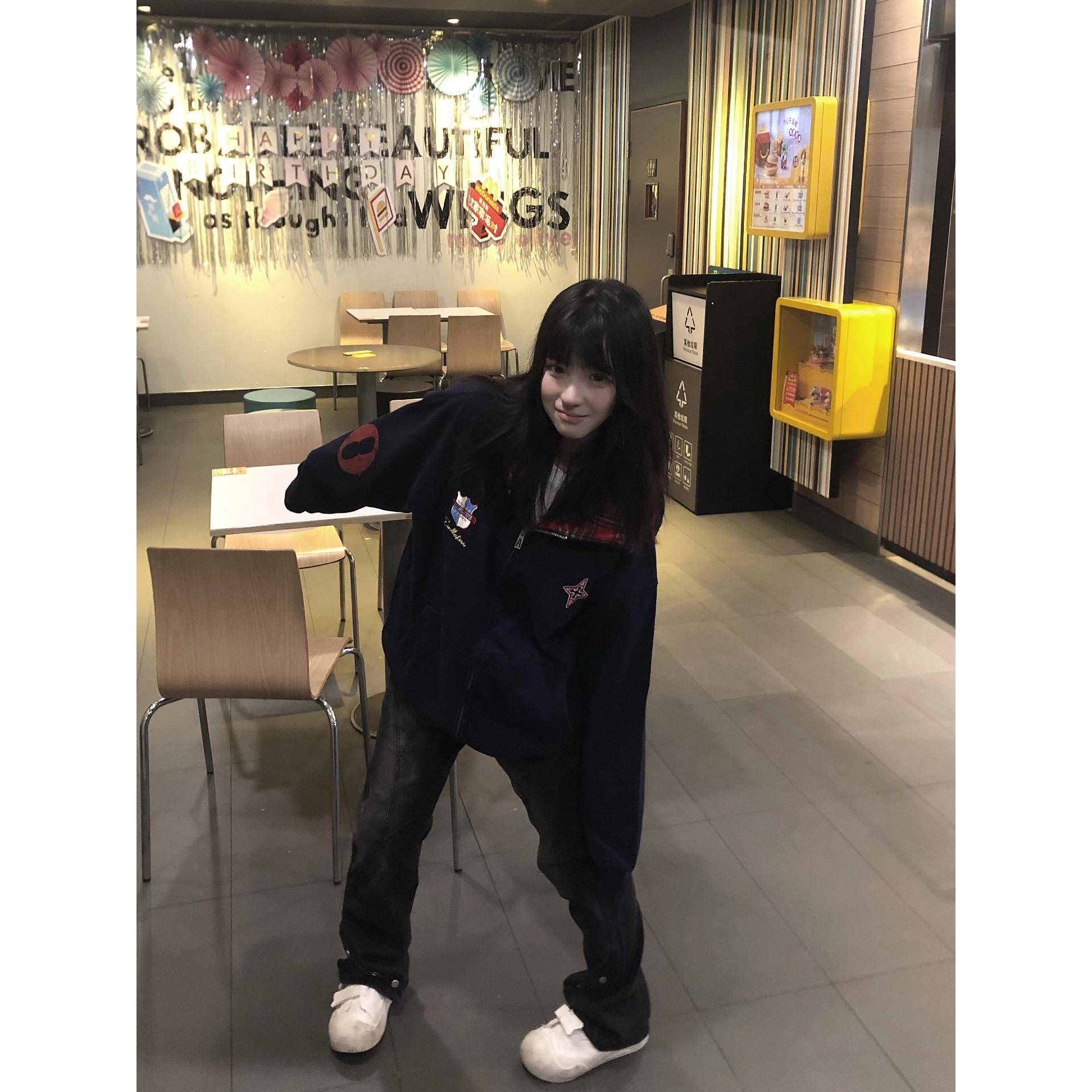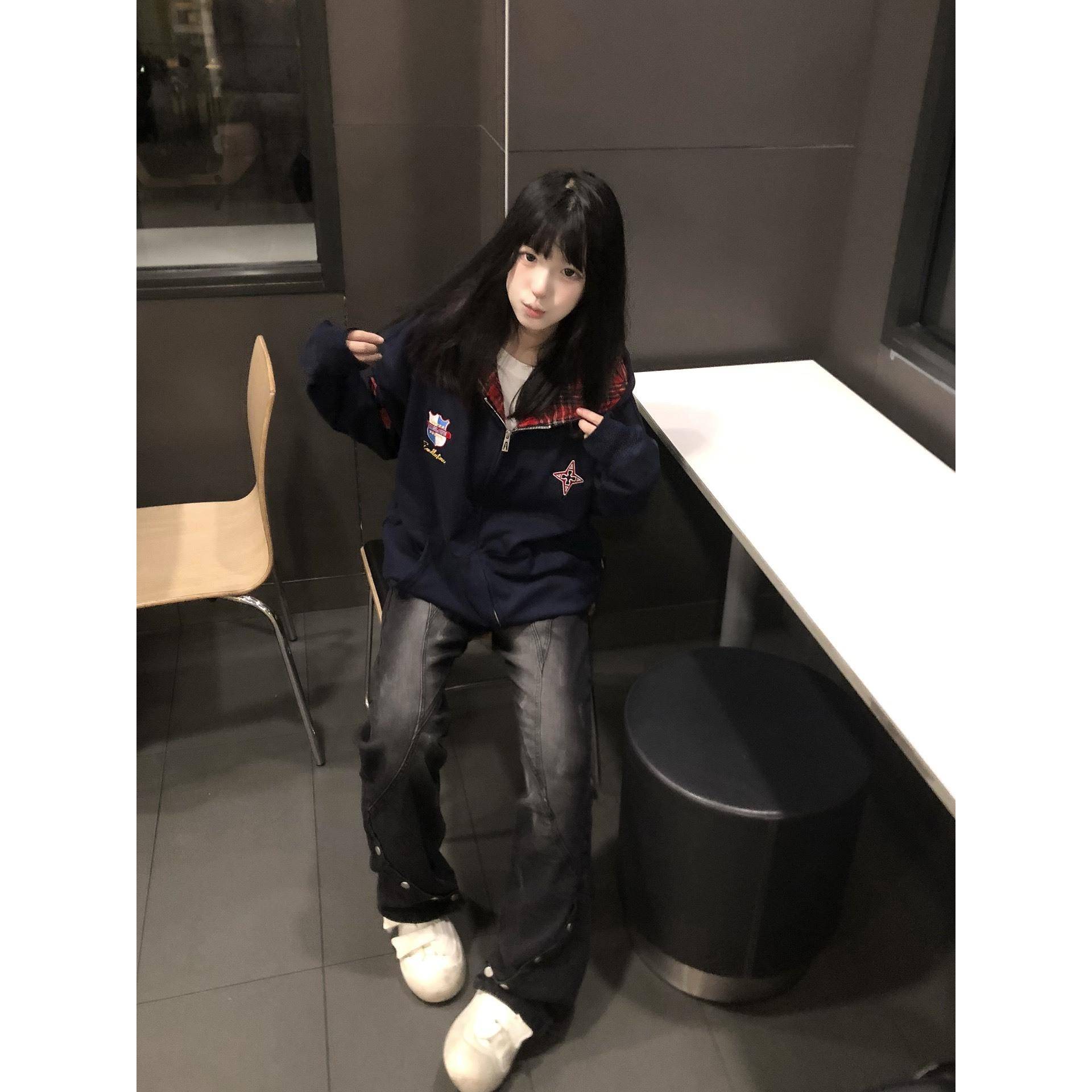 藏青色开衫连帽卫衣女秋冬季格子拼接小个子美式复古夹克学生外套