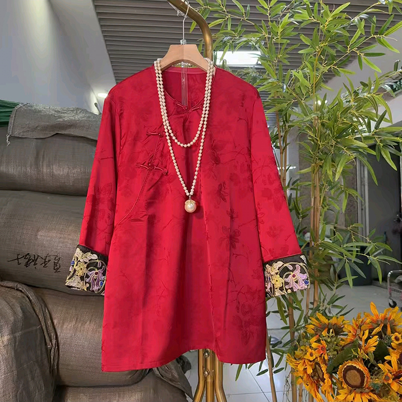 胖妹妹显瘦国风大码女装盘扣提花大衫2025早秋新款拼接袖复古衬衫