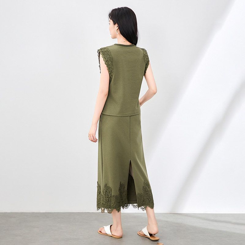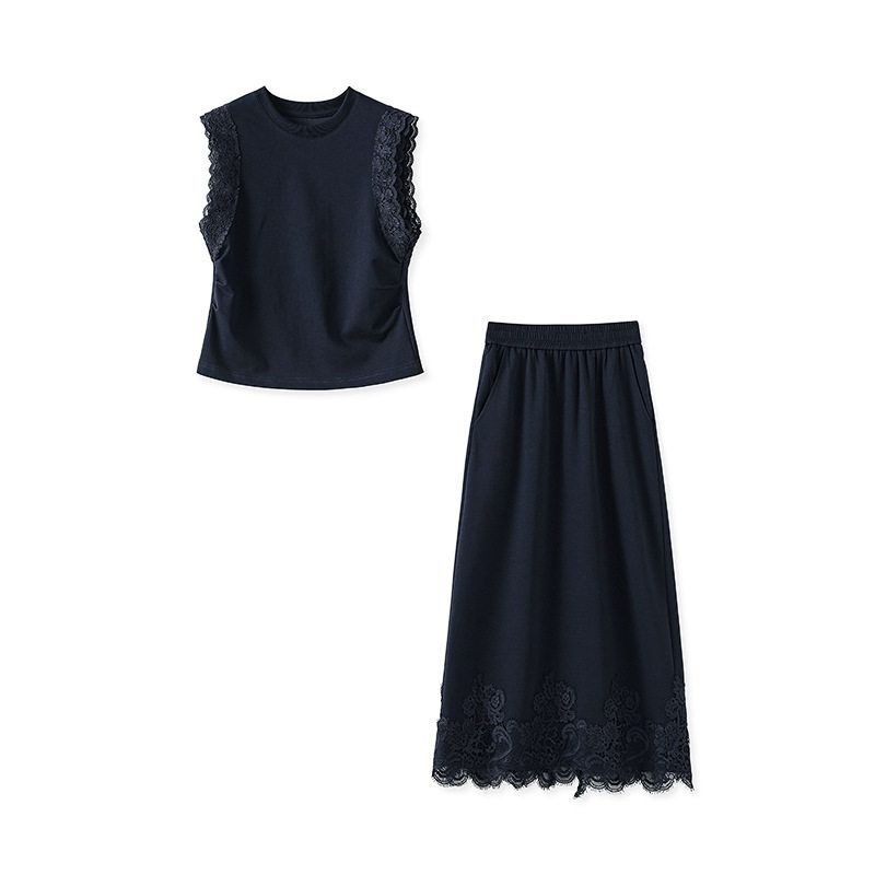 蕾丝拼接无袖上衣收腰半身裙套装