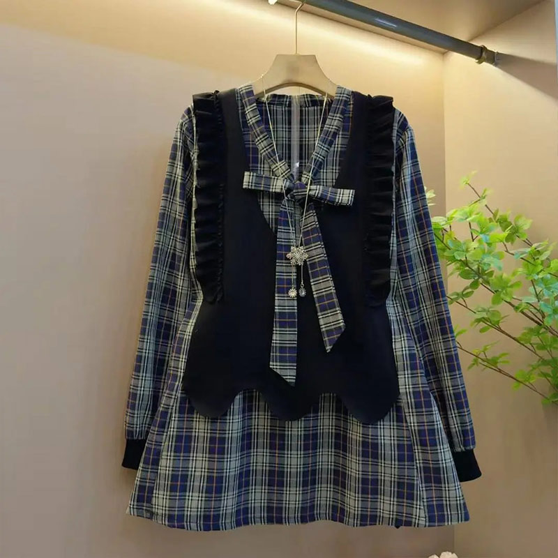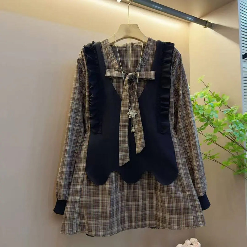 加肥系带领拼接格子长袖上衣
