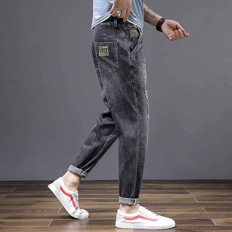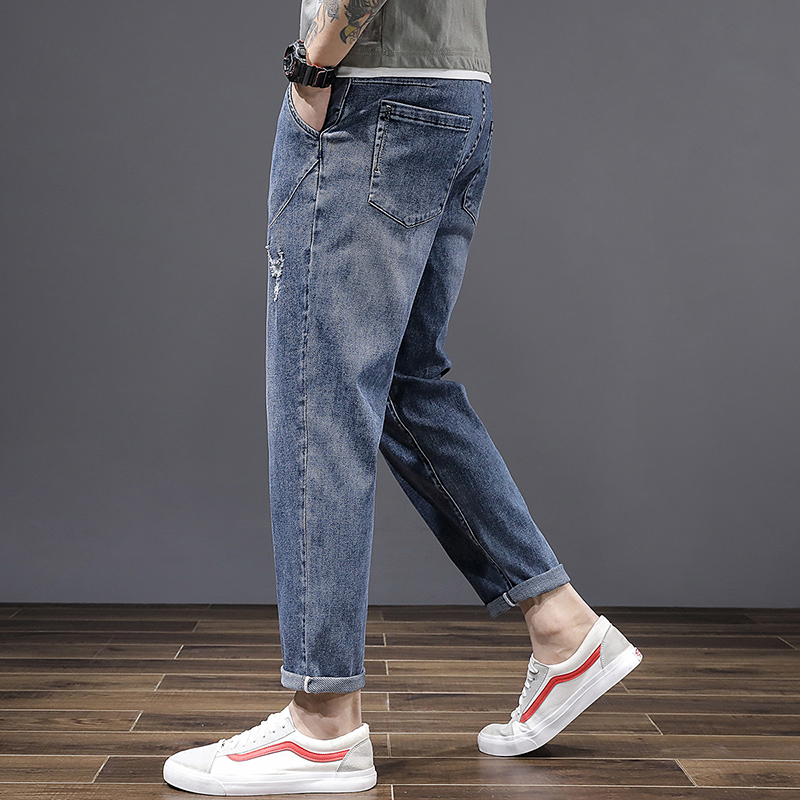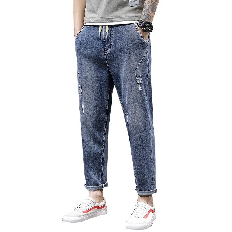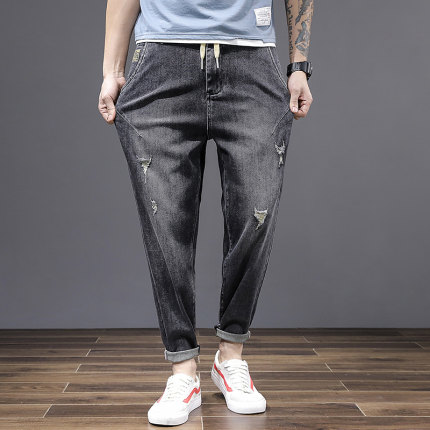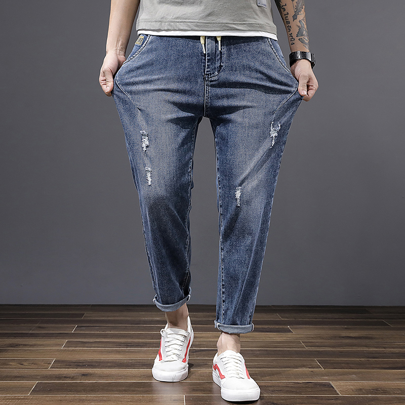 夏季超高弹力大码破洞九分牛仔裤男薄松紧腰带拉链抽绳小脚哈伦裤