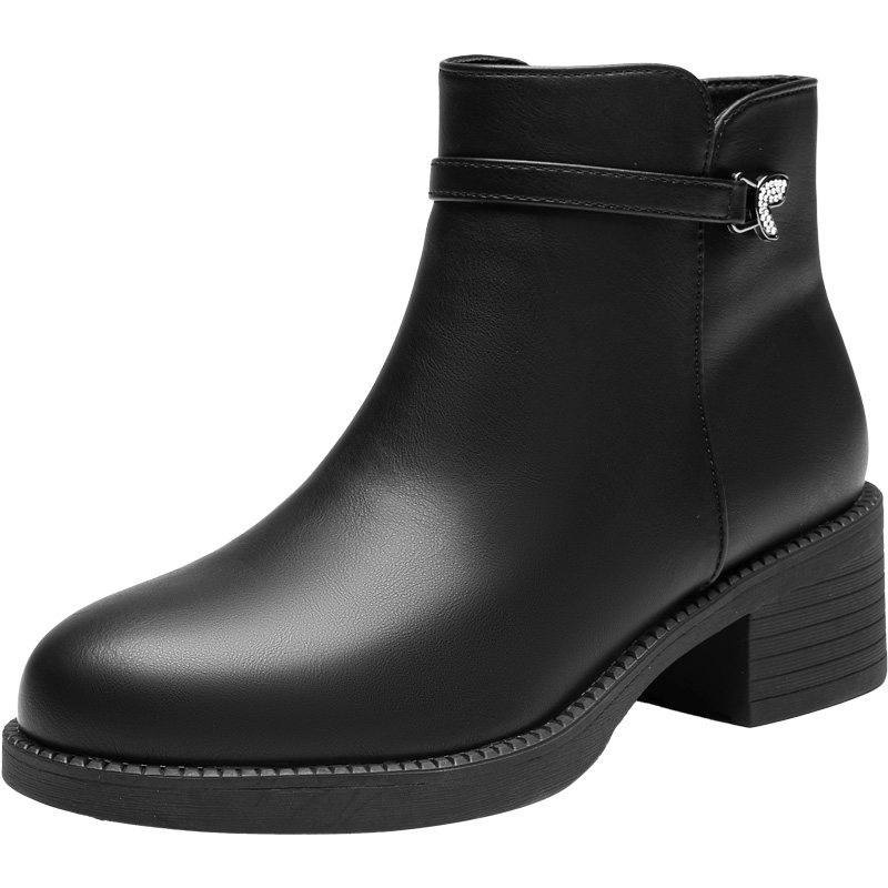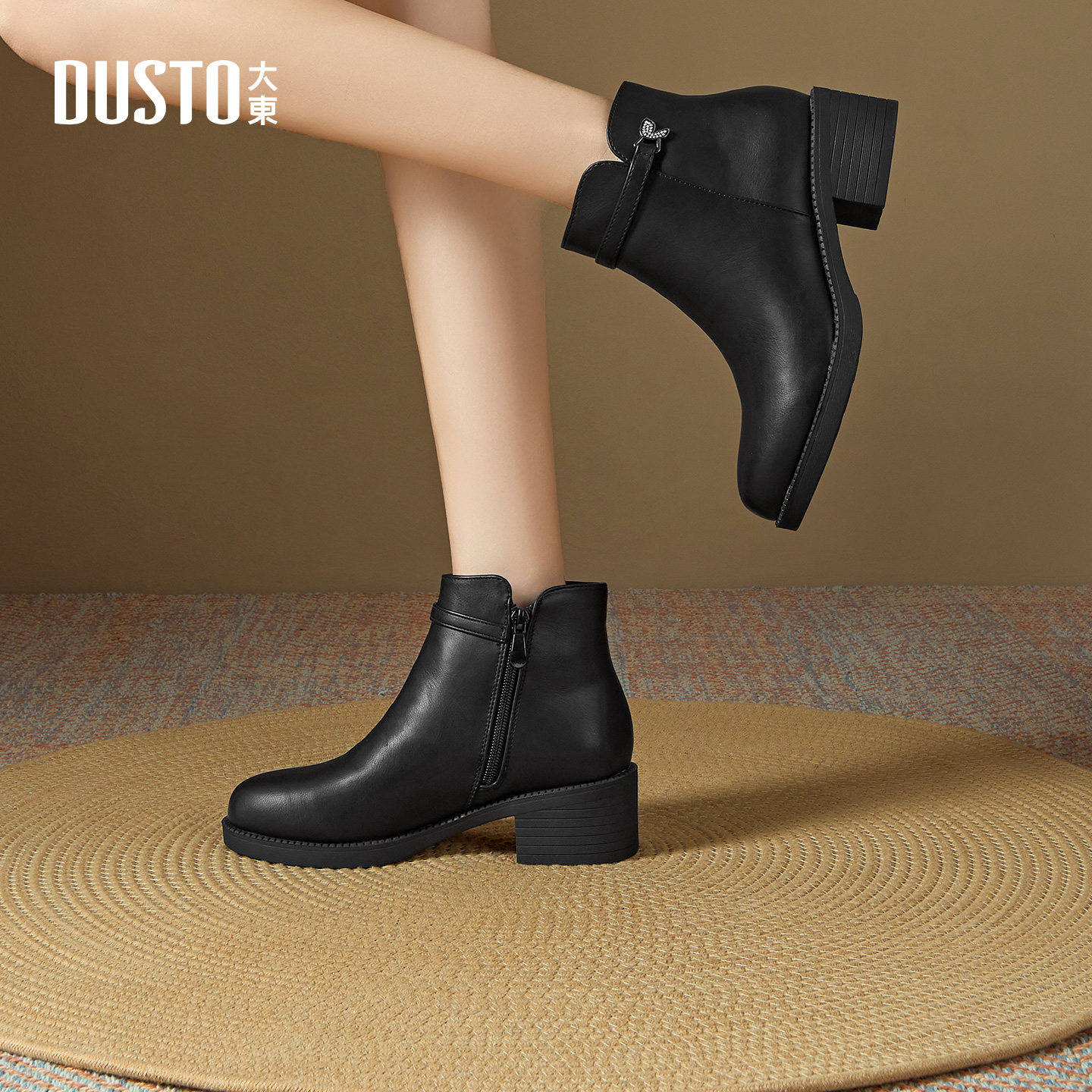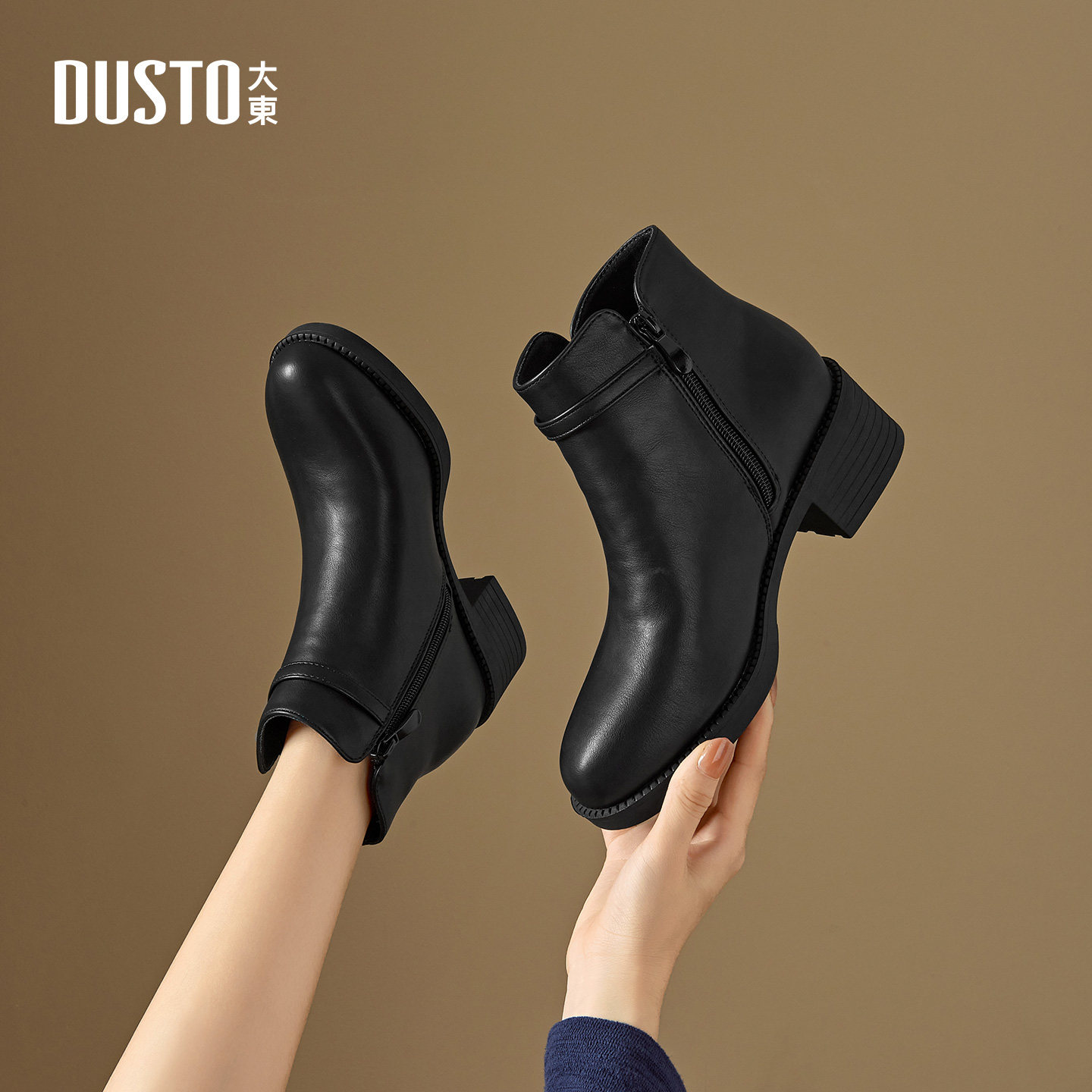 大东官方妈妈短靴女款2025新款冬季女士加绒靴子粗跟黑色女靴皮靴