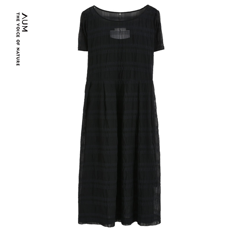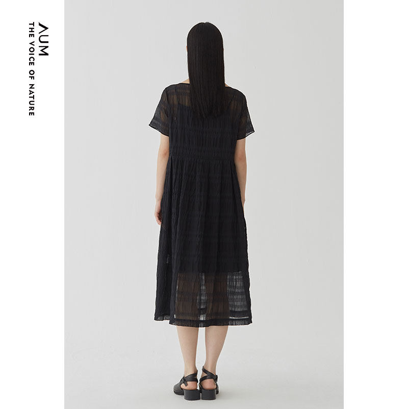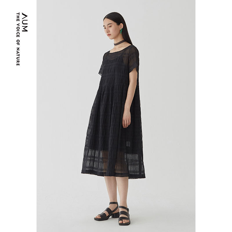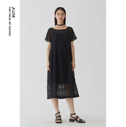 AUM噢姆夏季宽松圆领短袖娃娃裙黑色格纹拼接连衣裙