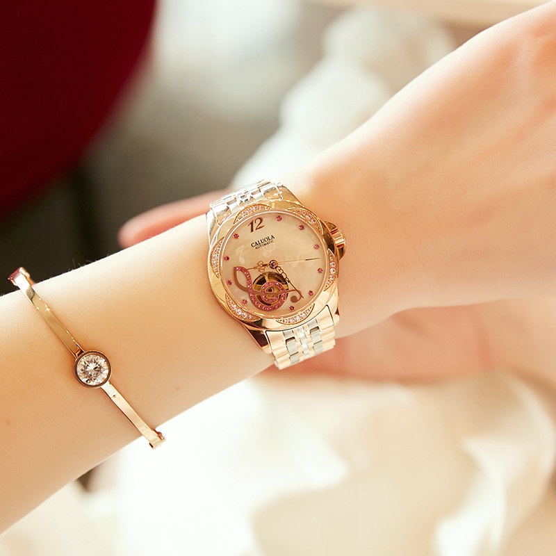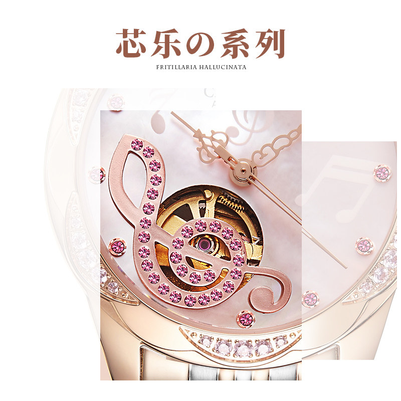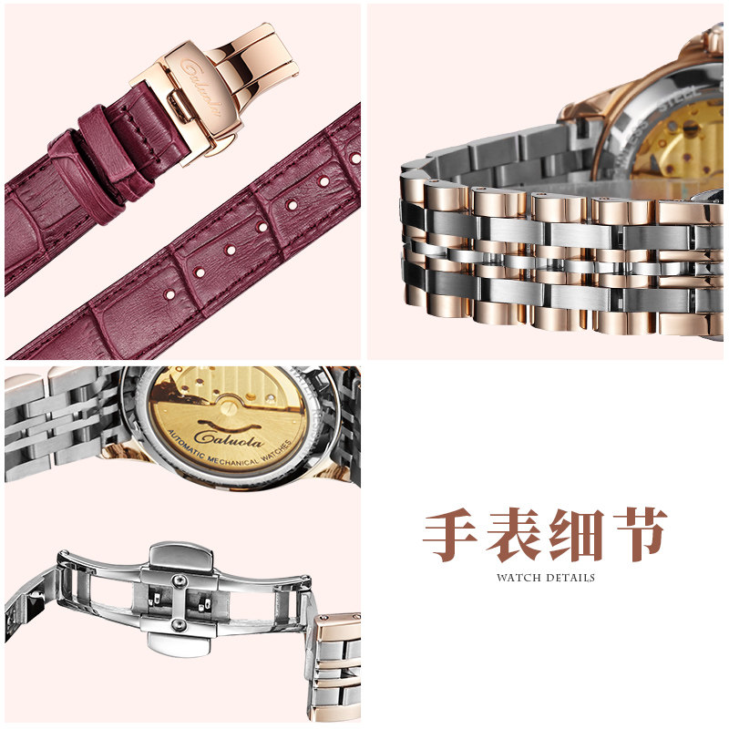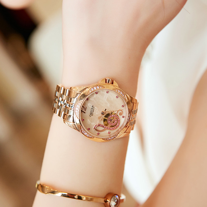 卡罗莱全自动机械表防水女士手表女表镂空潮流真皮带正品镶钻腕表