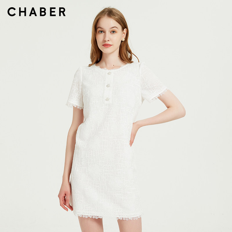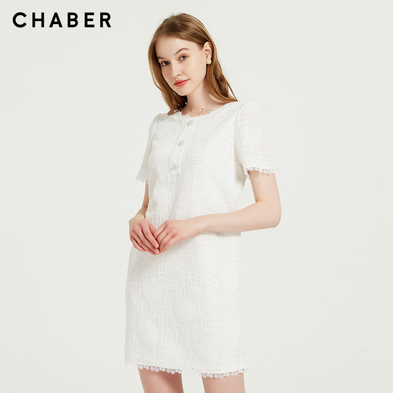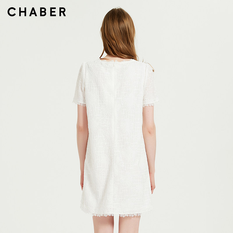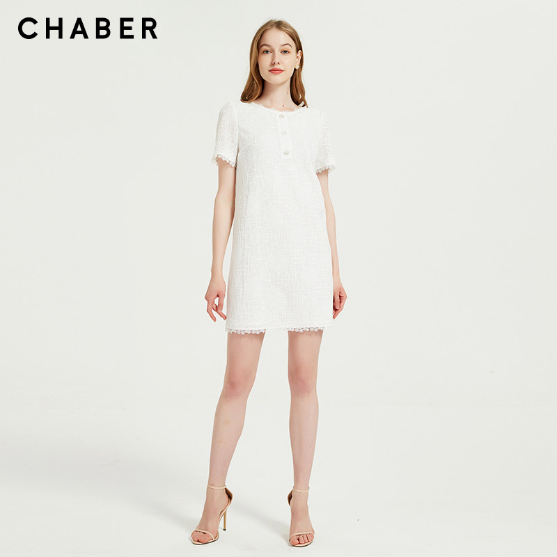 chaber巧帛夏季新品优雅肌理亮片百搭重工纯色直筒短袖连衣裙