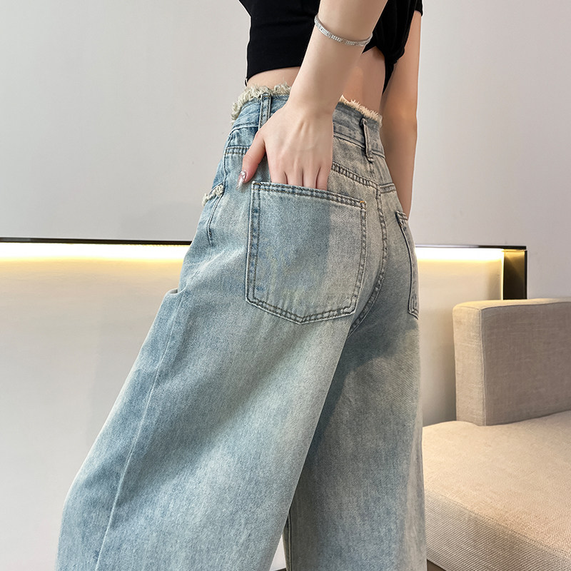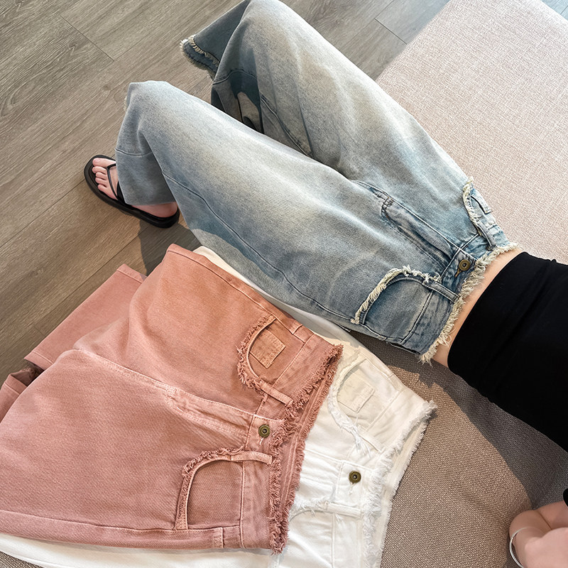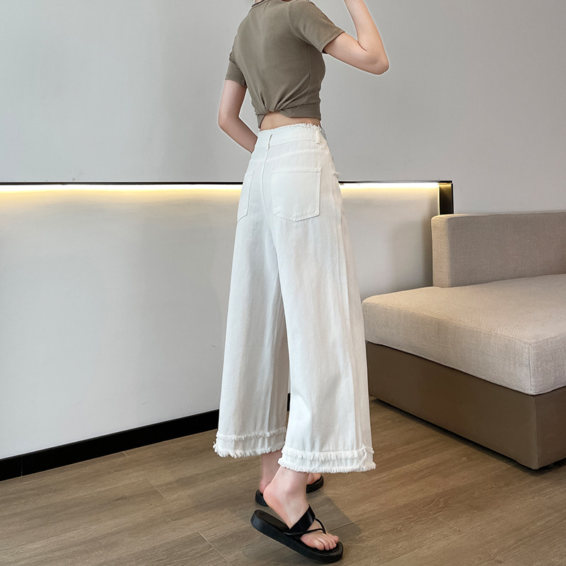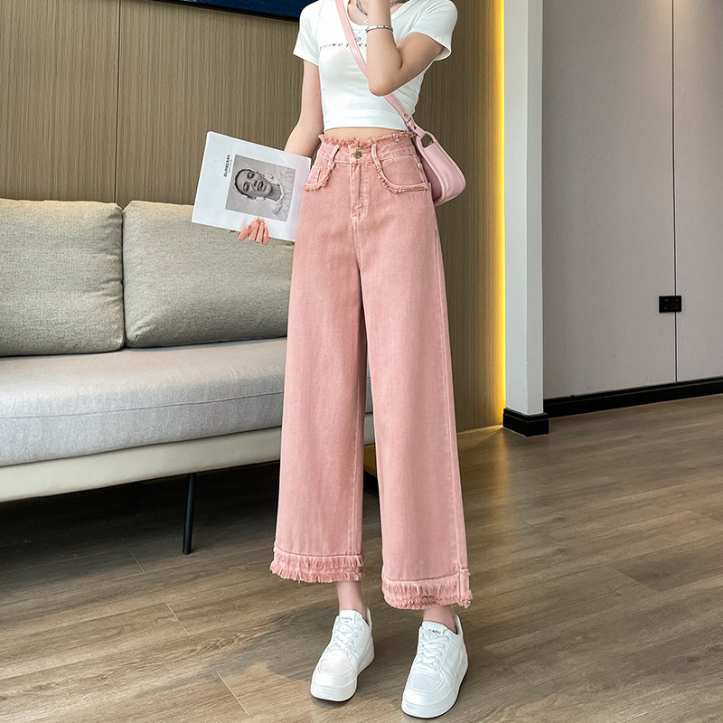 九分拼接牛仔裤女春夏薄款直筒高腰毛边八分小个子宽松复古阔腿裤