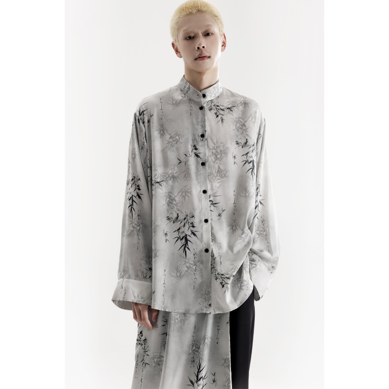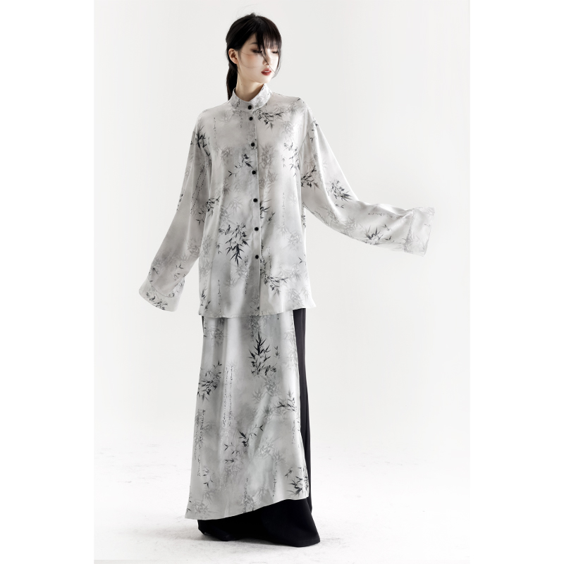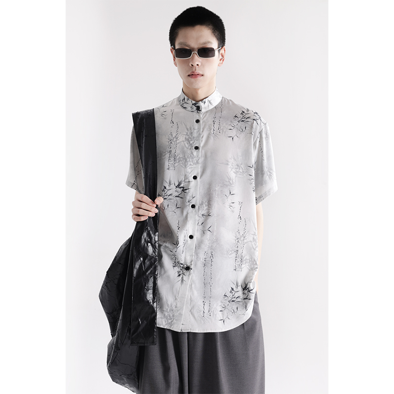 APOZi collection拟时系列新中式国风立领衬衫女水墨印花短袖上衣