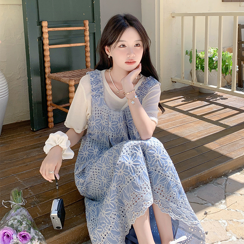 官网女装夏易菲韩系清纯减龄叠穿浅蓝色背带裙女2025夏季新款洋气
