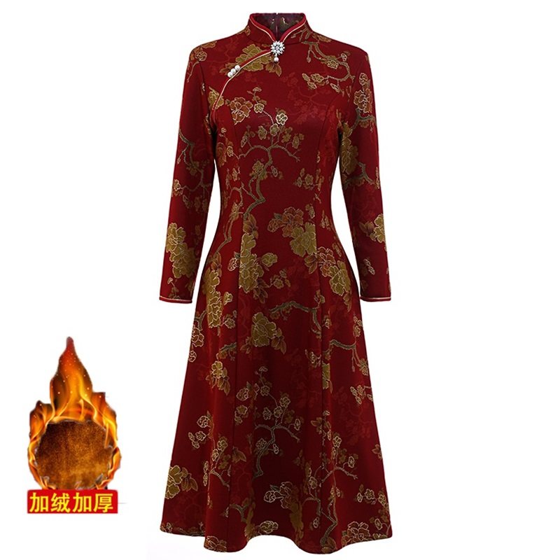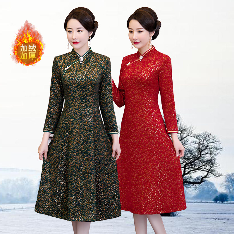 高档加绒加厚旗袍裙改良版中式婚礼服中长款妈妈装显瘦遮肚连衣裙