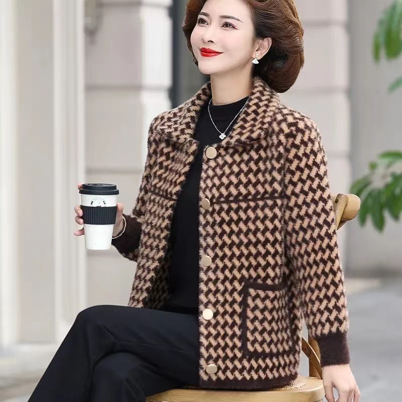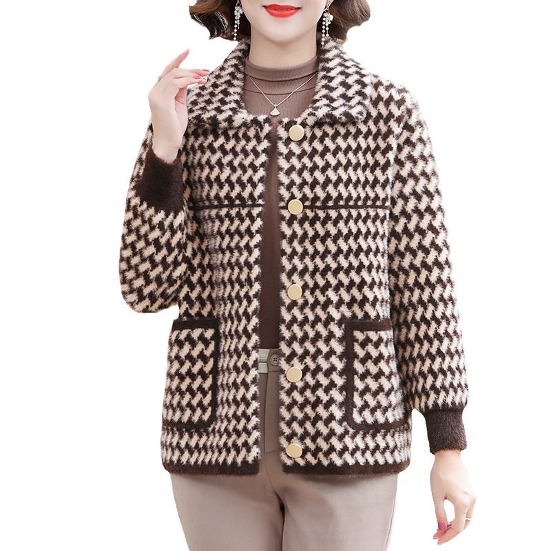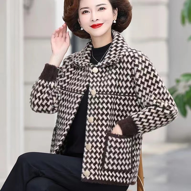 妈妈秋冬装水貂绒大衣大码羊绒开衫外搭洋气中老年短款连帽外套女